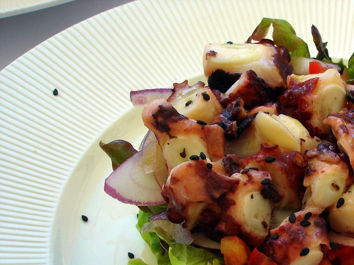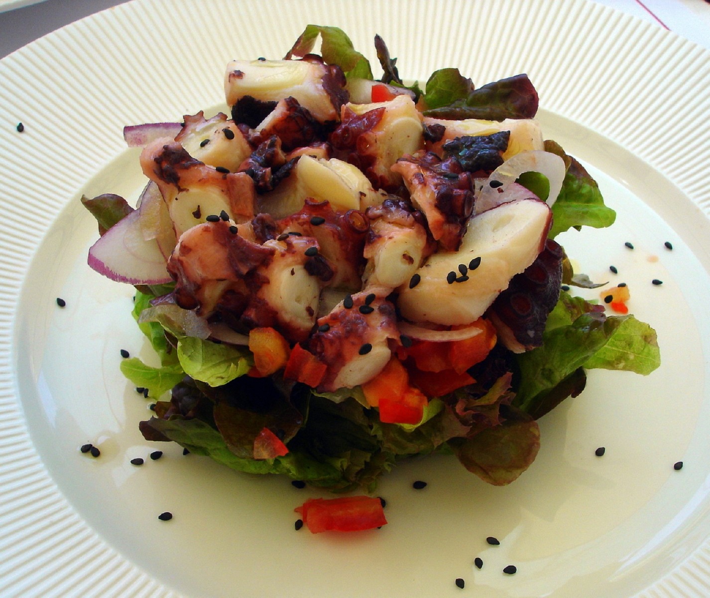 Empezamos nuestro menú con una «ensalada de pulpo, lechuga hoja de roble y vinagreta» (6’5€).