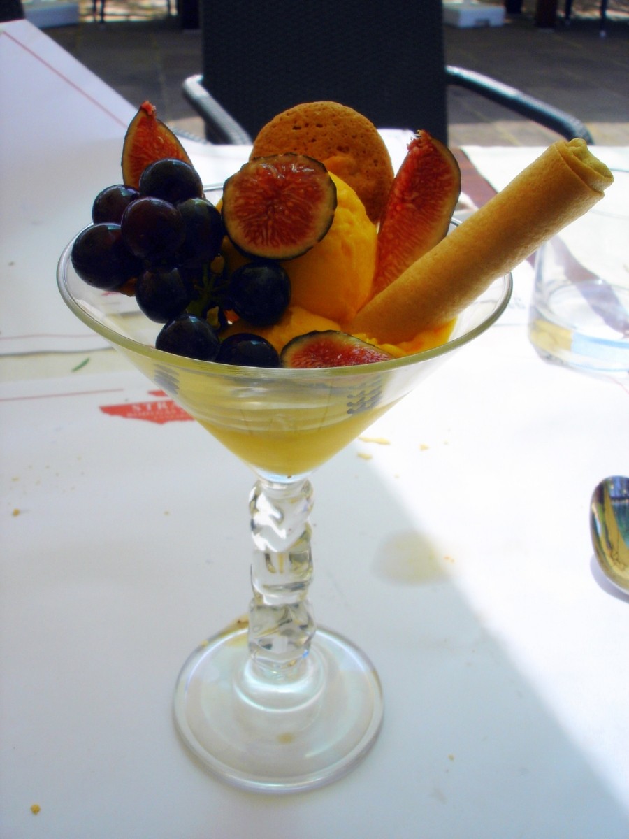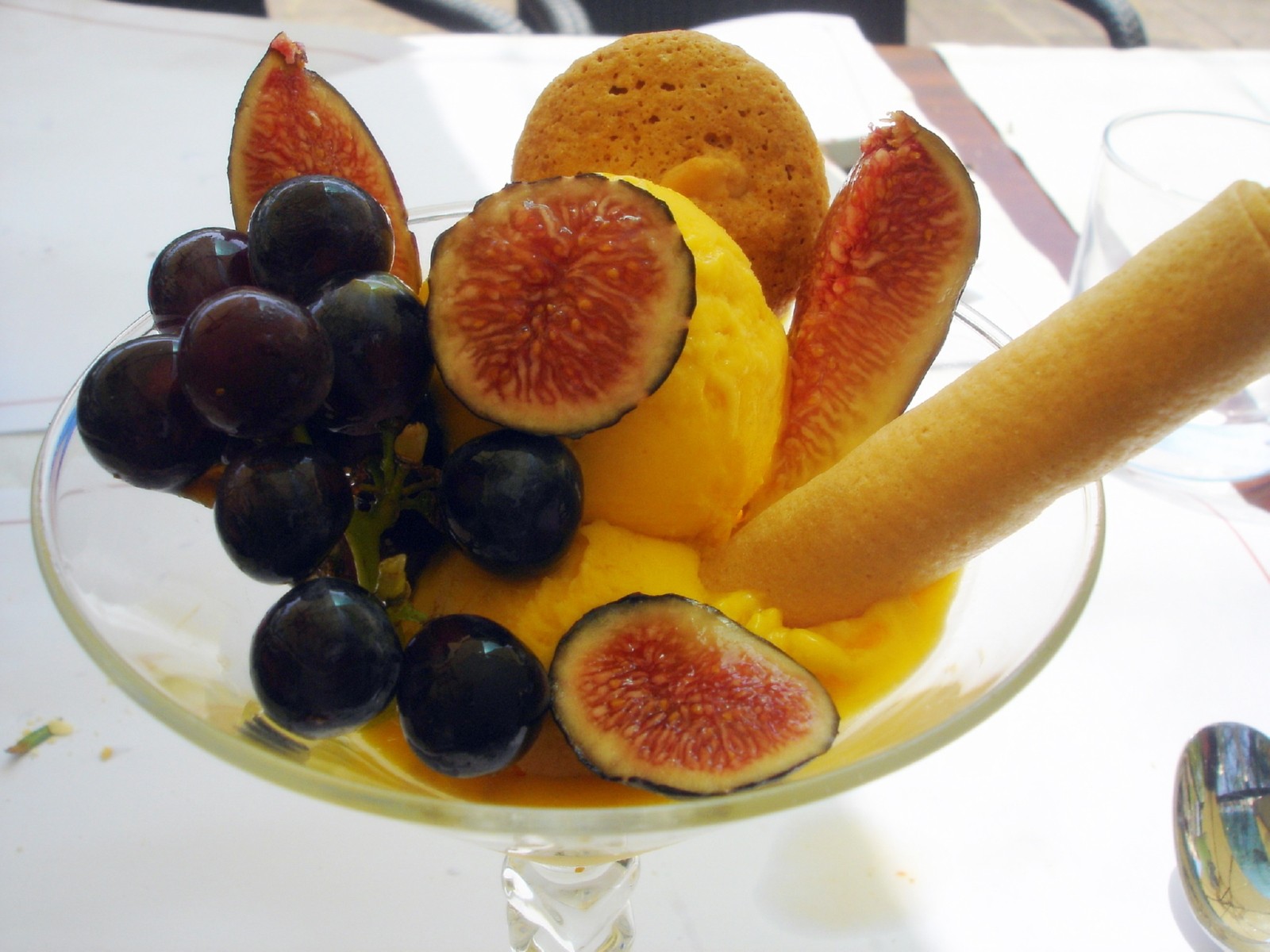 Un refrescante y sorprendente «Sorbete de Mango«(6’5 €), acompañado por uvas de la propia bodega, una pasta de almendras, higos frescos y canutillos rellenos de chocolate…¡Una verdadera delicia!
