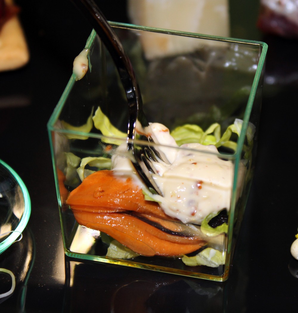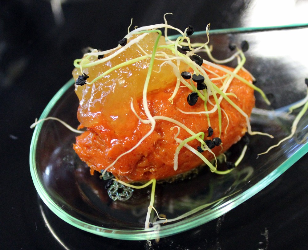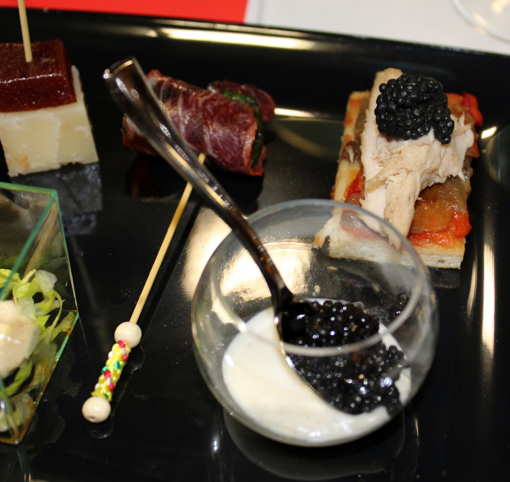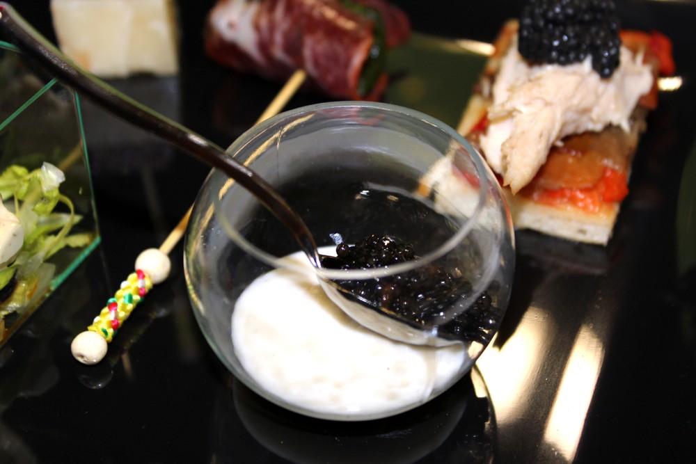 Mano a mano, han ido dictando las cualidades de las diferentes armonías y a cual mejor. Para comenzar un «Elyssia Pinot Noir» de 2010 ha estado armonizado con un «Pincho de Jamón Ibérico Real Jamón FS con fresón confitado». A continuación los asistentes a la cata pudimos comprobar cómo un exquisito cuvée «Trepat», 2010 combina a la perfección con una «Tapa de caviar Per Sé con crema de coliflor».