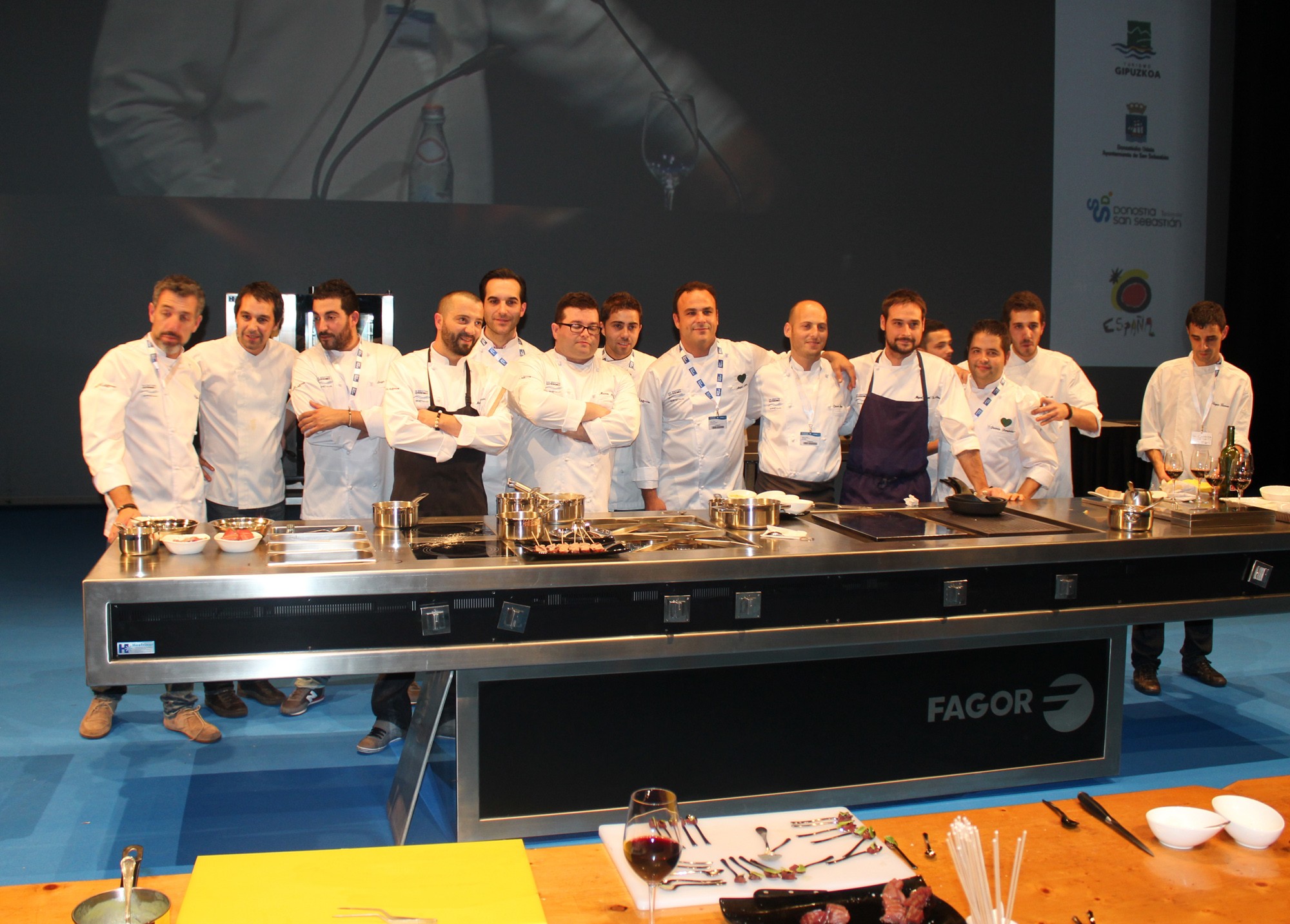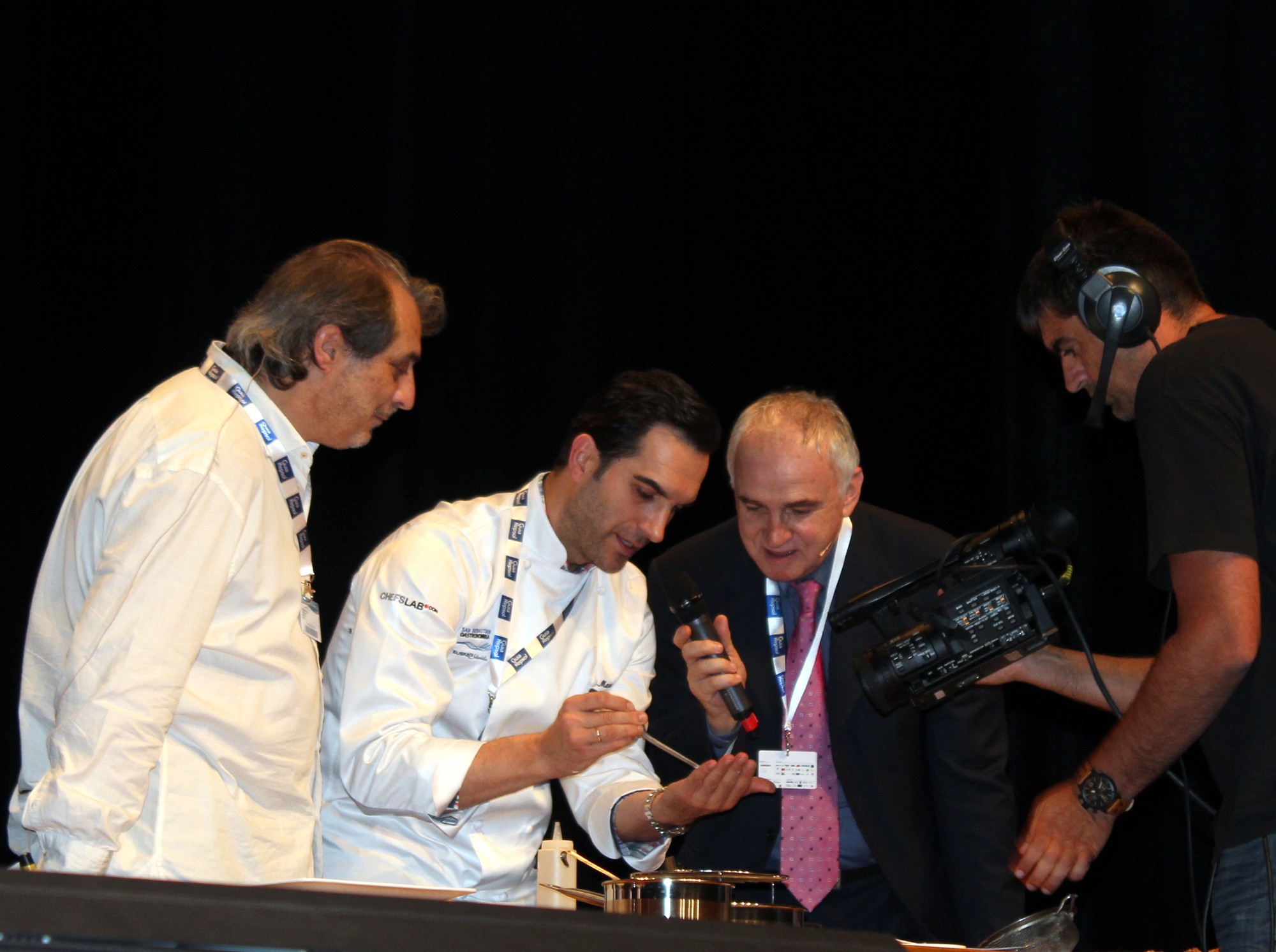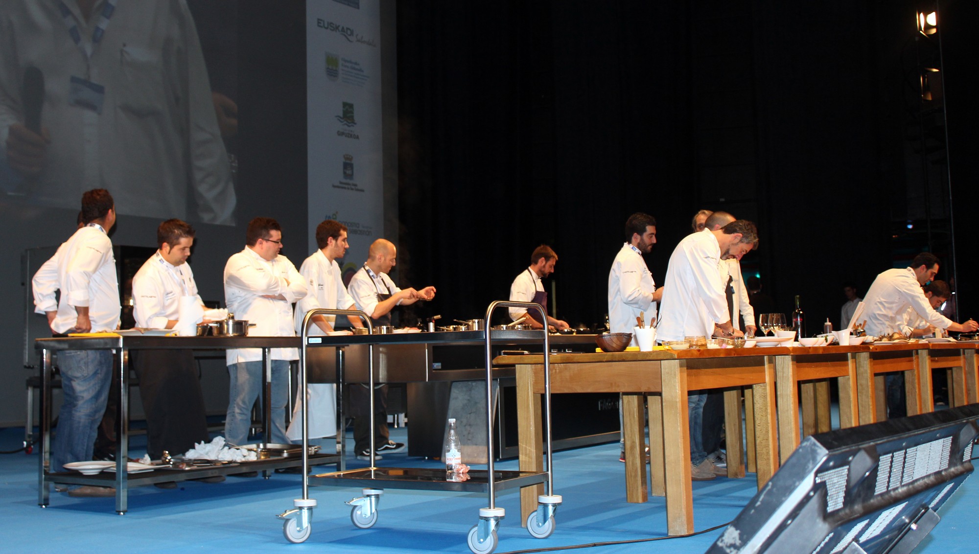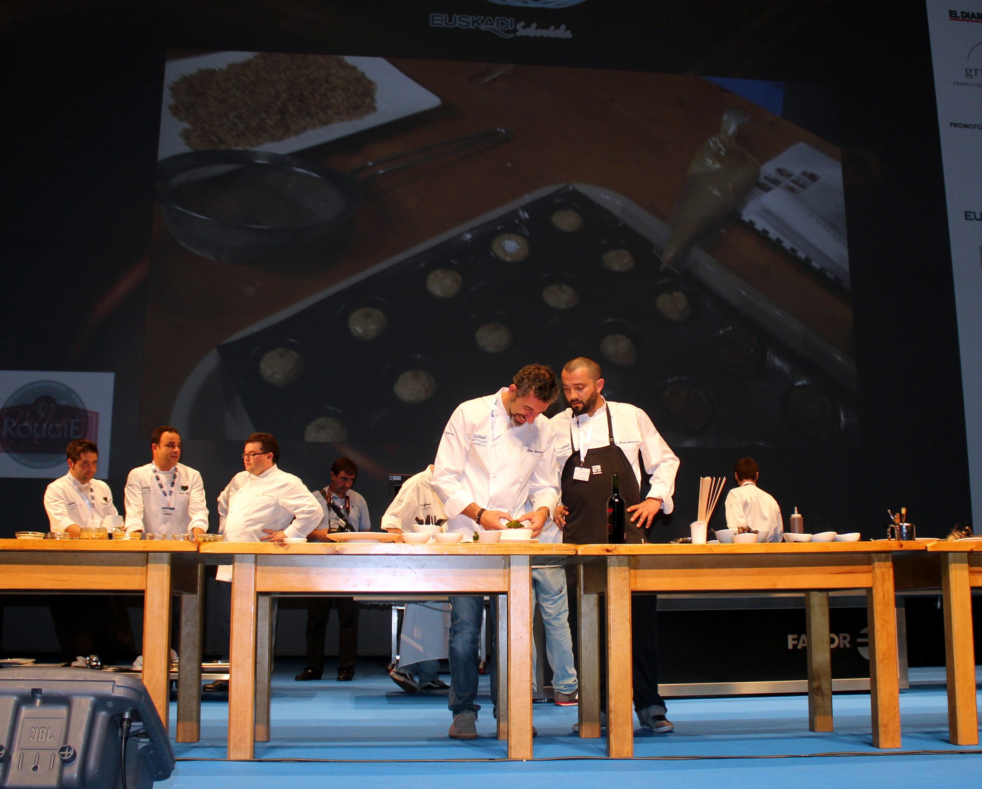 Tras presentar cada uno de ellos sus platos, los cocineros han ido pasando por las cocinas de sus compañeros y han hecho una especie de «Pic-nic» en el escenario de Kursaal, probando y disfrutando las distintas elaboraciones.