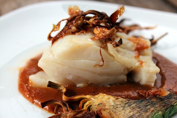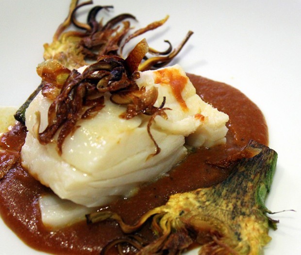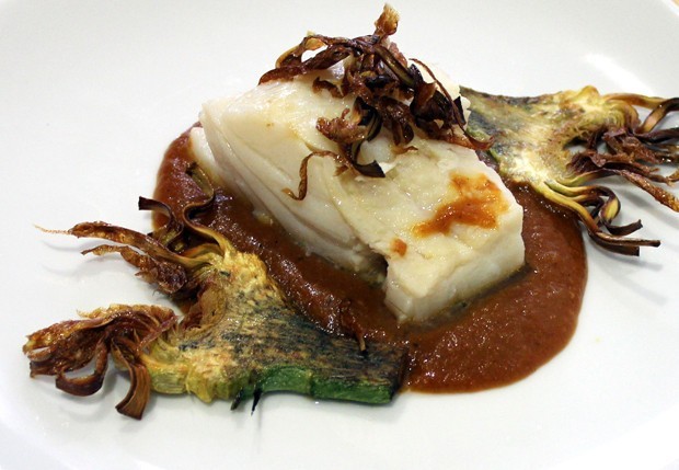 - Cubrimos el centro de un plato con la Salsa Vizcaína. Colocamos un trozo de bacalao encima y adornamos con un par de láminas de alcachofa frita.