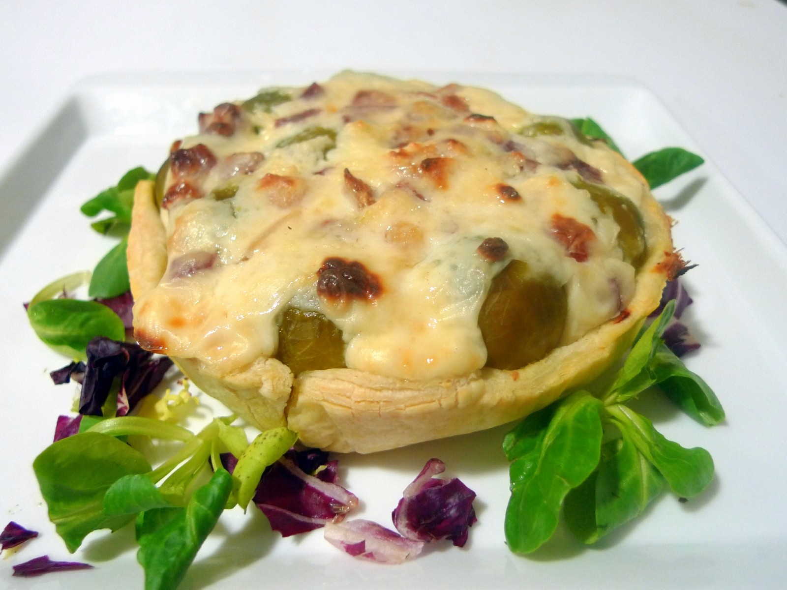 Una manera diferente, en la presentación, son estas «Coles de Bruselas con bechamel en hojaldre».