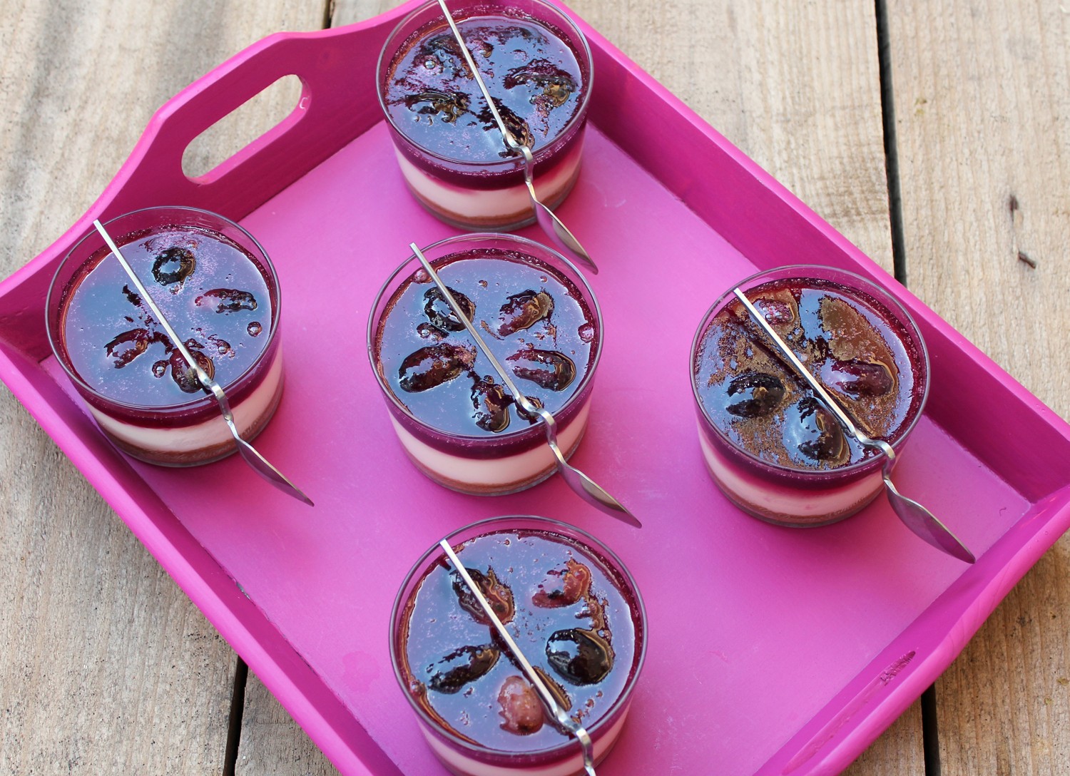 8. Cuando esté cuajada la crema de queso, sacamos de la nevera, colocamos cinco mitades de uva en su superficie y cubrimos con la jalea de uvas.