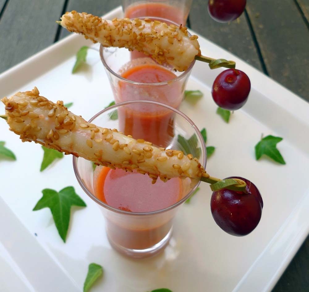 - El gazpacho de cerezas lo puedes acompañar con un poco de carpaccio de bacalao , dados de atún marinados o, como en nuestro caso, unas brochetas de colas de langostinos (hechas a la plancha y rebozadas de sésamo), acompañadas de una cereza.