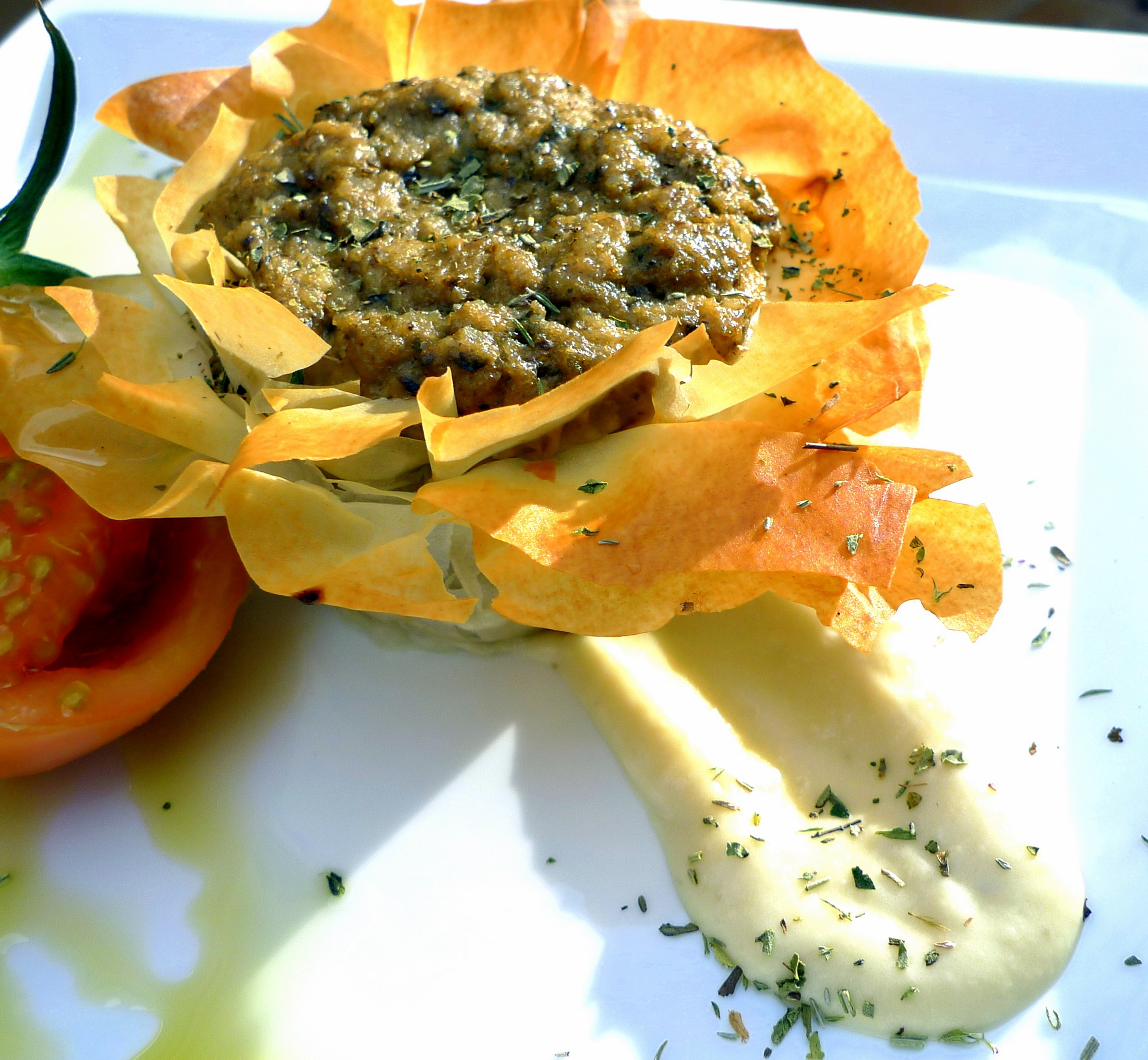 - Servimos los pastelitos de rodaballo con una crema de azafrán y un cuarto de tomate raf, aderezado con aceite de oliva virgen.