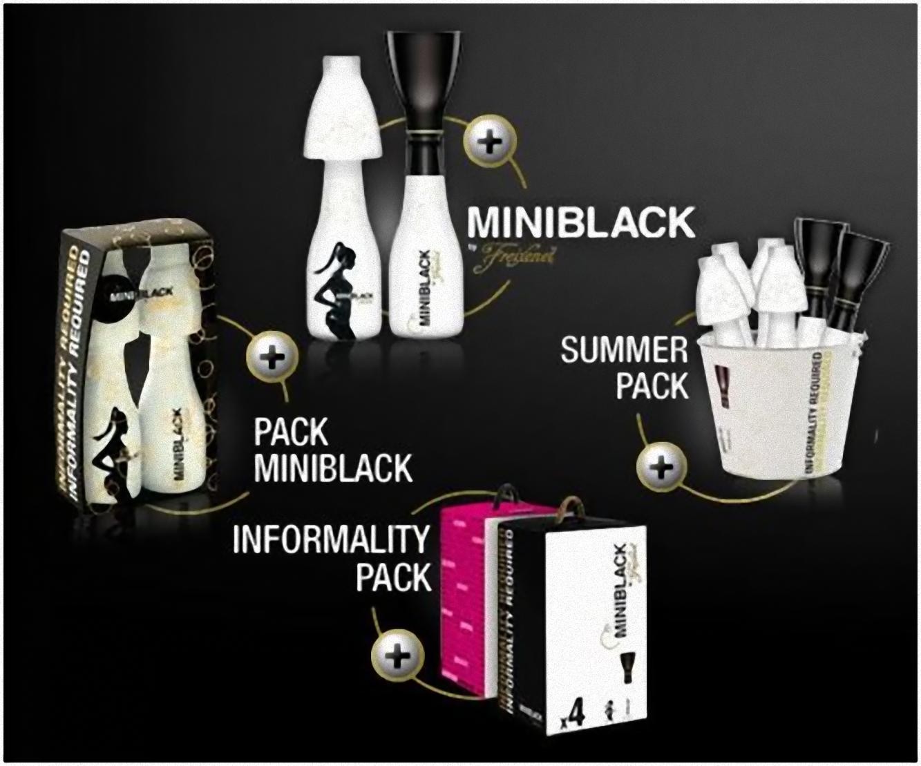 Miniblack by Freixenet está enfocado a un público joven, moderno y actual, al tiempo que persigue cambiar los hábitos de consumo del cava. Para ello, la original botella de 20 cl. incorpora una copa que facilita la movilidad del consumidor.