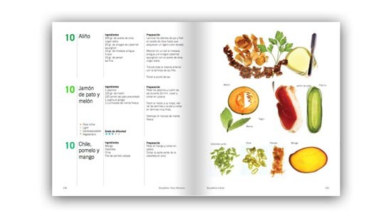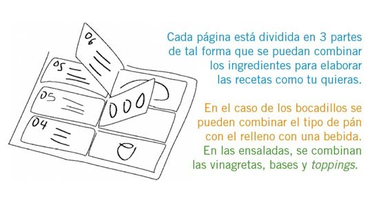 «Bocadillos y Ensaladas», es toda un novedad tanto por su formato como el concepto y contenidos que trae. Es un libro diferente. Nos aporta una novedad visual, ya que las hojas están divididas en tres partes para que se puedan combinar las fichas de ingredientes.