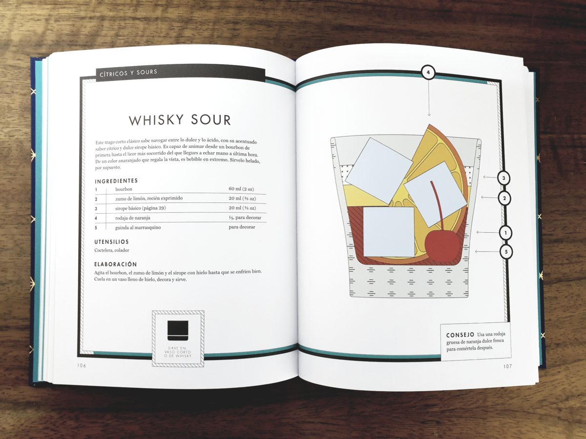 Un manual o recetario que incluye también recetas de siropes, sours e infusiones, y que revela los secretos de clásicos como el «Old Fashioned», el «Martini de vodka» (agitado, no mezclado) o el gin-tonic perfecto. Aunque también nos sorprende con cócteles más atrevidos como el Rattlesnake, el Mojito de ruibarbo o el Sour de granada.