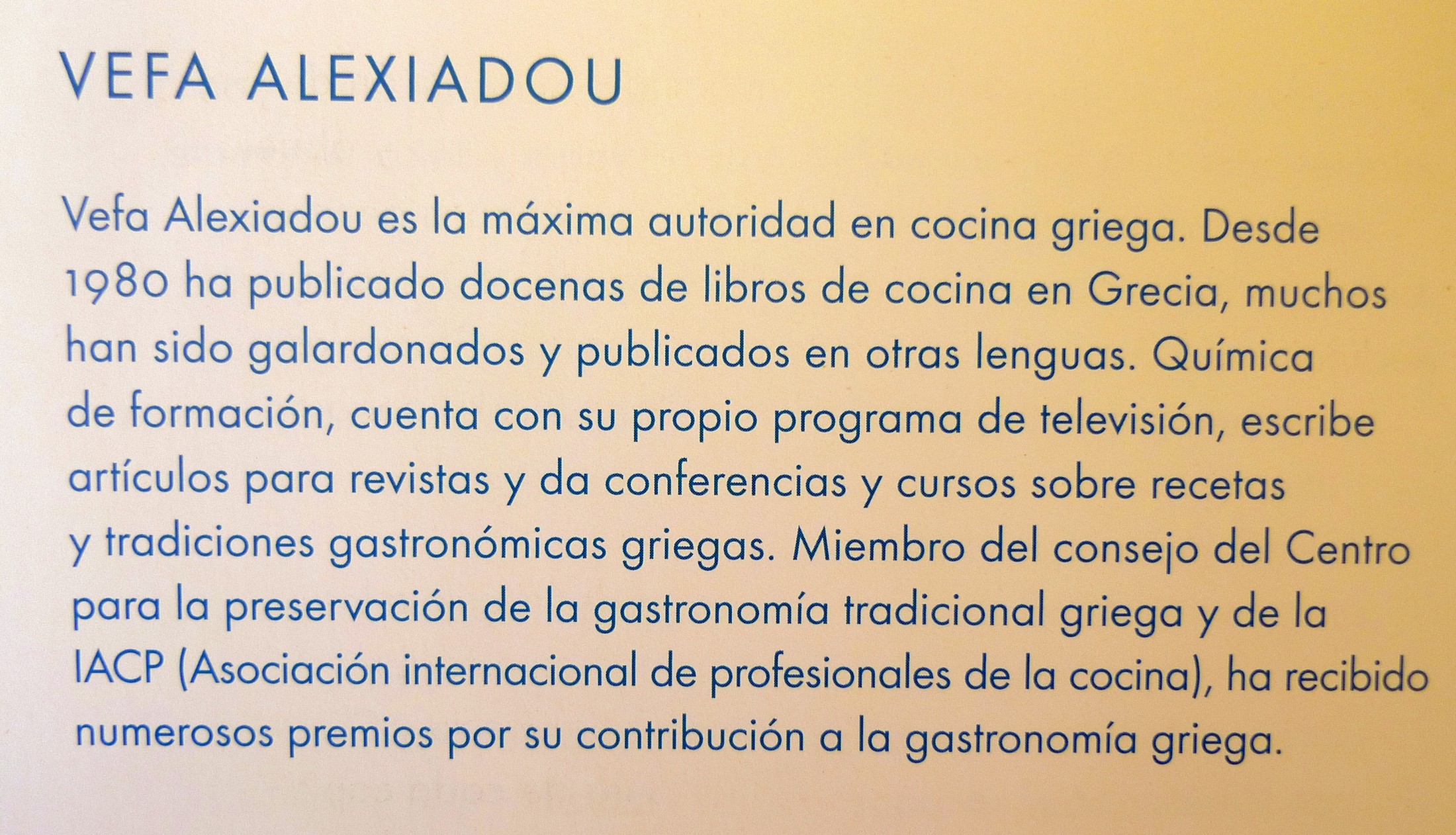 [alert type=white ]Vefa Alexiadou es a toda un autoridad en gastronomía griega. En Grecia ha publicado varios libros de cocina de los que ha vendido numerosos ejemplares, cuenta con una serie de televisión propia y asiduamente escribe artículos para revistas, imparte conferencias y ofrece demostraciones relacionadas con la cocina de su país. Alexiadou ha formado parte del comité del Centro para la Conservación de la Gastronomía Griega Tradicional. [/alert]