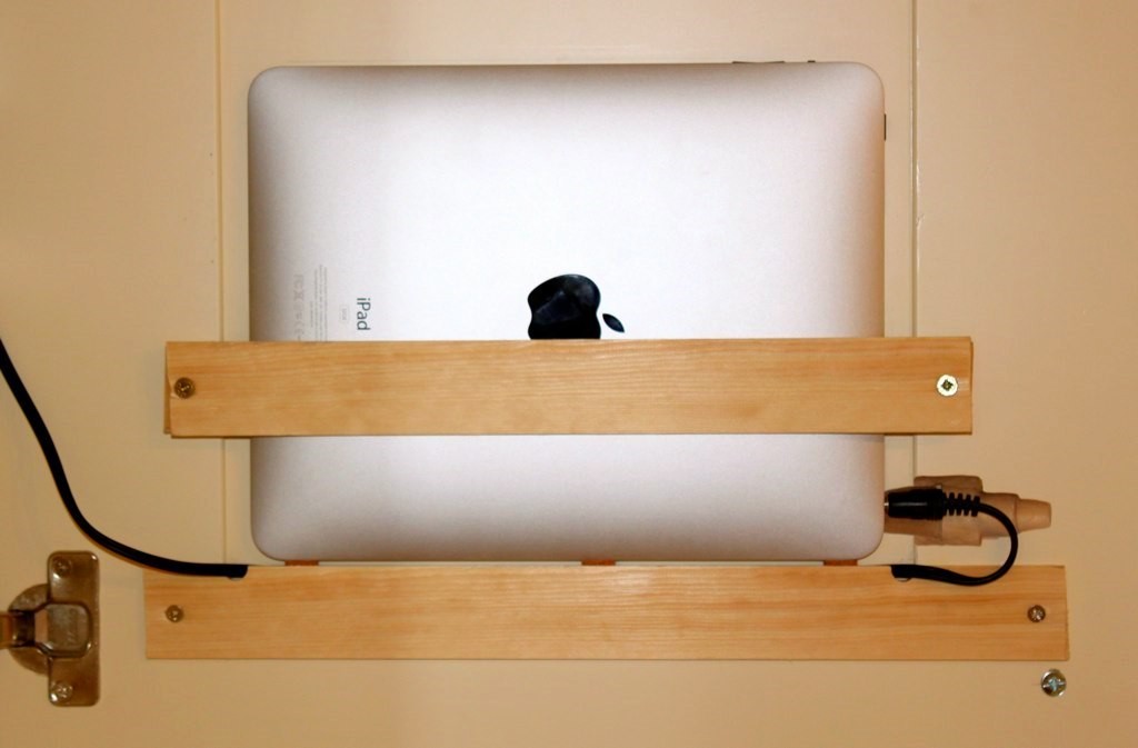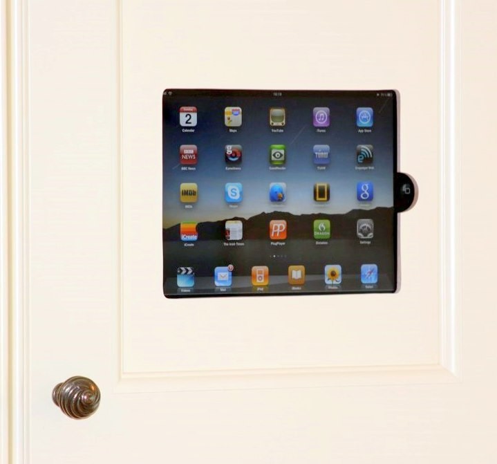 El montaje es muy simple, con una caladora realizó un agujero, del tamaño de la pantalla del iPad (9’7″), en una puerta de su armario de cocina. Después colocó unas guías interiores para sujetar el iPad en cuestión. De esta forma el iPad puede ser eliminado fácilmente deslizándolo hacia arriba y hacia fuera de la montura.