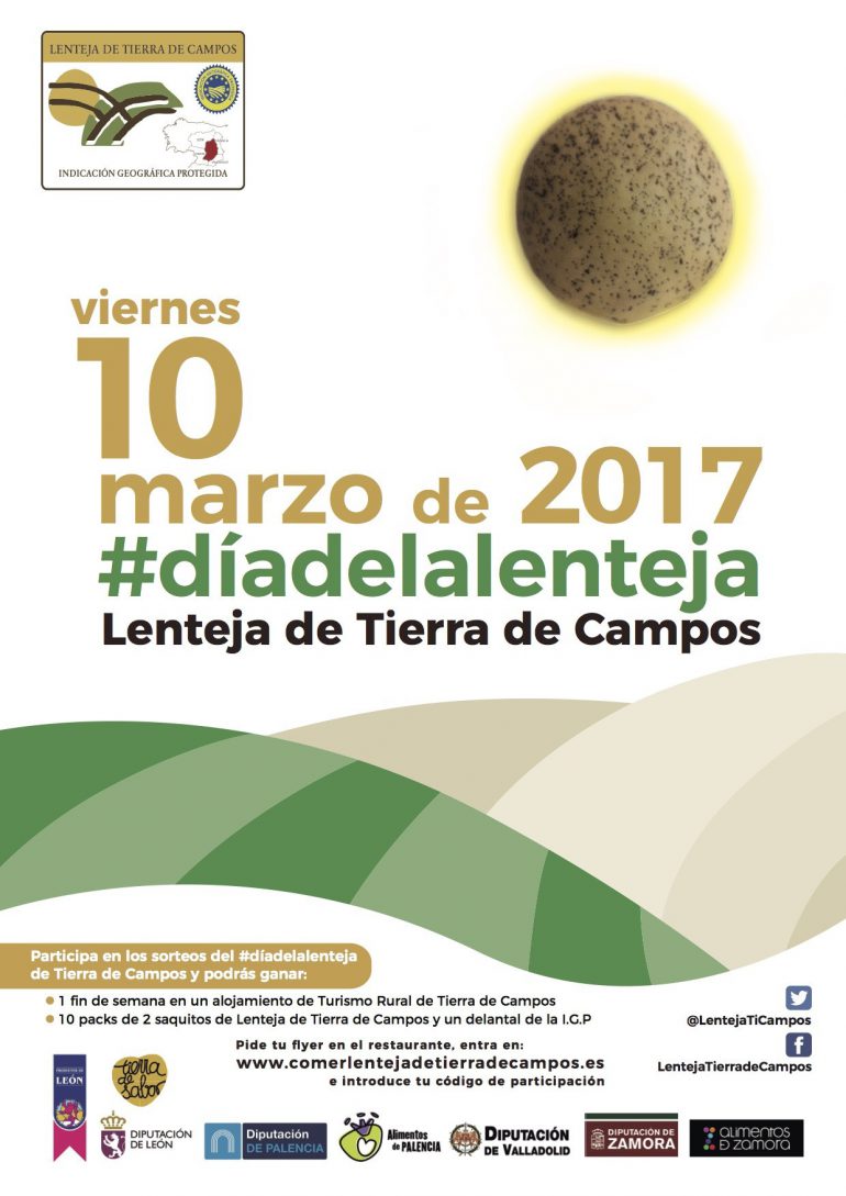 Tomar o comprar lentejas de Tierra de Campos en el #díadelalenteja tiene premio. Tanto si acudimos a cualquiera de los restaurantes oficiales como si adquirimos Lenteja de Tierra de Campos en los puntos de venta «oficiales», nos darán la opción de participar en el sorteo de dos estancias de fin de semana para dos personas en un Centro de Turismo Rural de Tierra de Campos y hacernos ganar uno de los veinte packs compuestos por dos saquitos de Lenteja de Tierra de Campos de 0,5 kg y un delantal de nuestra I.G.P. que están en juego.