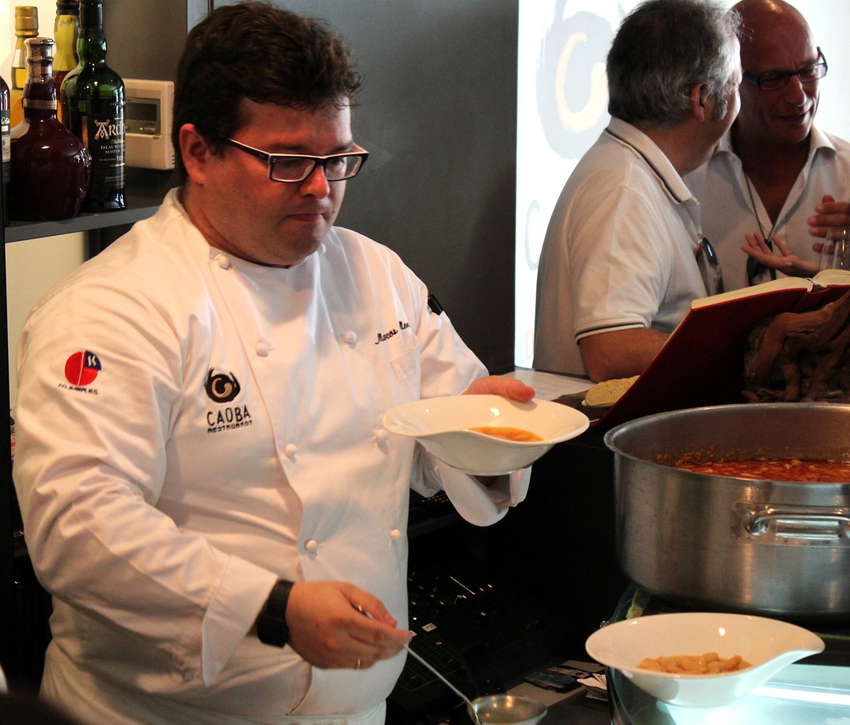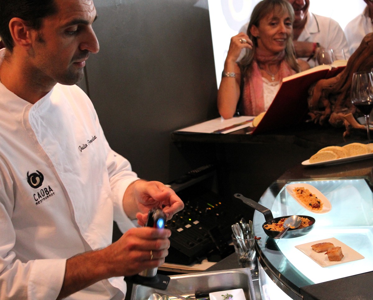 El chef anfitrión, Vincenzo Marconi, preparo para el Show Cooking «De Caoba al Cielo» un «Raviolo de sepia y gambas rojas«. Una de las mejores tapas del evento, que se acompañaba con huevas de pez volador y una ligera lámina de remolacha, además de una guarnición de fresas y cerezas picadas.