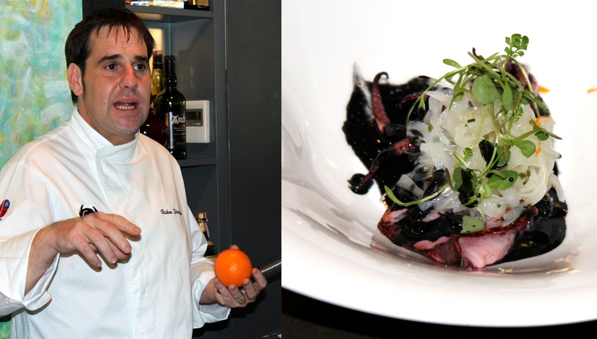 El primero en preparar su tapa fue el cocinero Rubén Trincado. Un delicado «Chipirón de anzuelo», que como su nombre indica era un chipirón hecho al momento montado sobre su propia tinta, con brotes tiernos y piel de naranja. Un bocado tierno y sabroso.