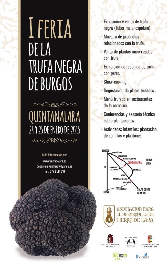 Con motivo de divulgar el consumo de la trufa negra (Tuber melanosporum) que se extraen de los encinares y quejigares de la provincia de Burgos, la Asociación para el Desarrollo de Tierra de Lara en colaboración con el consistorio de Quintanalara ha organizado para este fin de semana, 24 y 25 de enero de 2015, la I Feria de la Trufa Negra de Burgos.