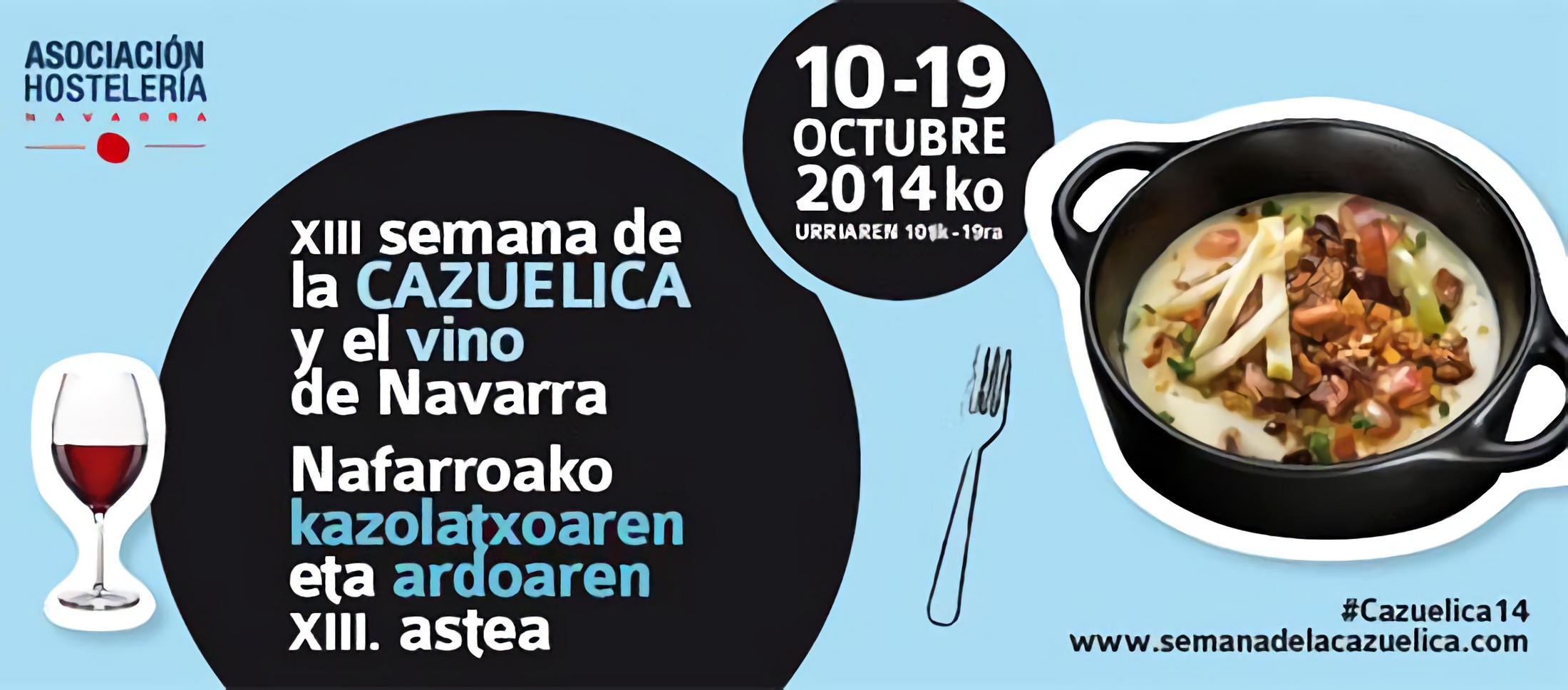 Del 10 al 19 de octubre de 2014 la Asociación de Hostelería de Navarra organizará la Semana de la Cazuelica y su maridaje con el Vino de Navarra 2014. Un evento que año tras año gana adeptos gracias a la calidad y originalidad de las cazuelitas presentadas al concurso y los vinos de Navarra que las acompañan.