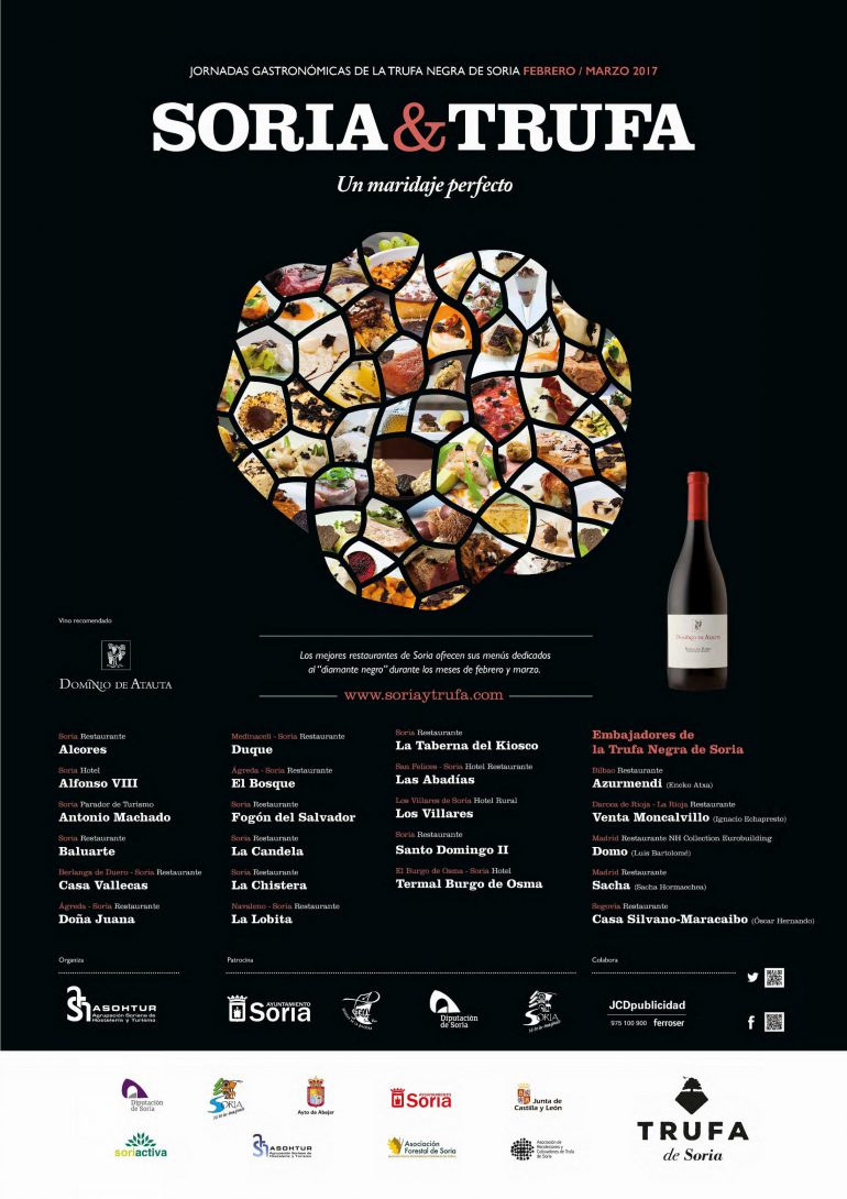 Durante los meses de febrero y marzo (hasta el 19 de marzo) tradición y creatividad se funden en los fogones de varios restaurantes sorianos para ofrecer a los comensales los mejores platos a base de Trufa. 17 «Trufimenús» que tienen como objetivo explorar y dar a conocer las dimensiones gastronómicas que tiene uno de los productos sorianos por excelencia, la Trufa Negra.