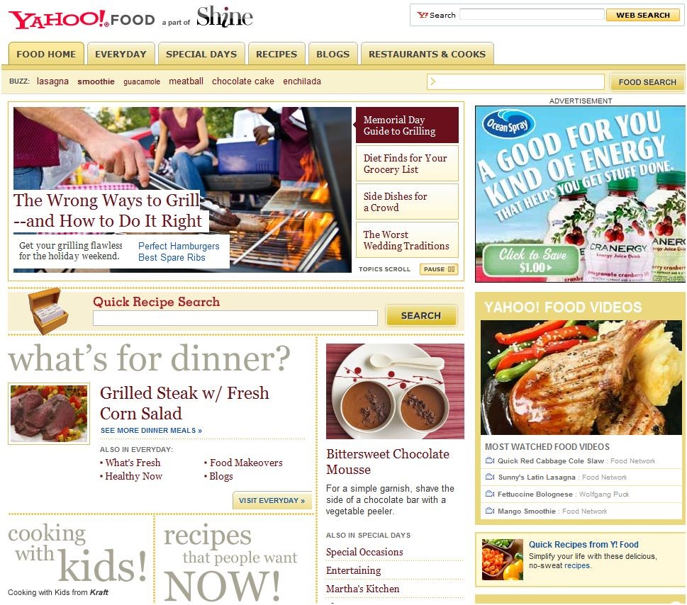 Yahoo ofrece la posibilidad de consultar una base de datos de recetas, aplicaciones personalizadas que recuerdan a los usuarios sus últimas búsquedas en el sitio y una vasta red social de gente unida alrededor de intereses comunes sobre la comida.