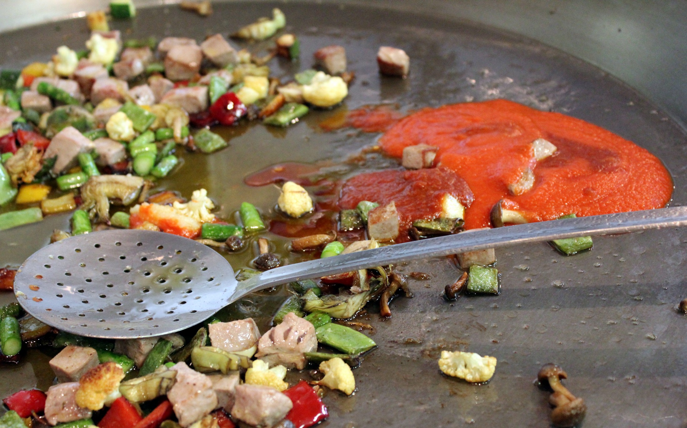 Lo primero de todo para hacer un arroz alicantino es sofreír las verduras con unas cucharadas de aceite de oliva. Coliflor, pimiento rojo y verde, judías verdes, espárragos, calabacín, etc., echando siempre de más a menos duras.