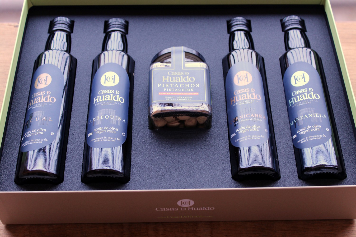 Arbequina, Picual, Cornicabra y Manzanilla son los diferentes aceites mono varietales que comercializa «Casas de Hualdo», aparte de dos coupages -Reserva Familia y Partida Real. Unos aceites elaborados con las aceitunas recolectadas de los 300.000 olivos que la almazara tiene en su finca de Toledo, usando métodos tradicionales con las técnicas más avanzadas para obtener un «Oro líquido» con unas propiedades organolépticas extraordinarias.