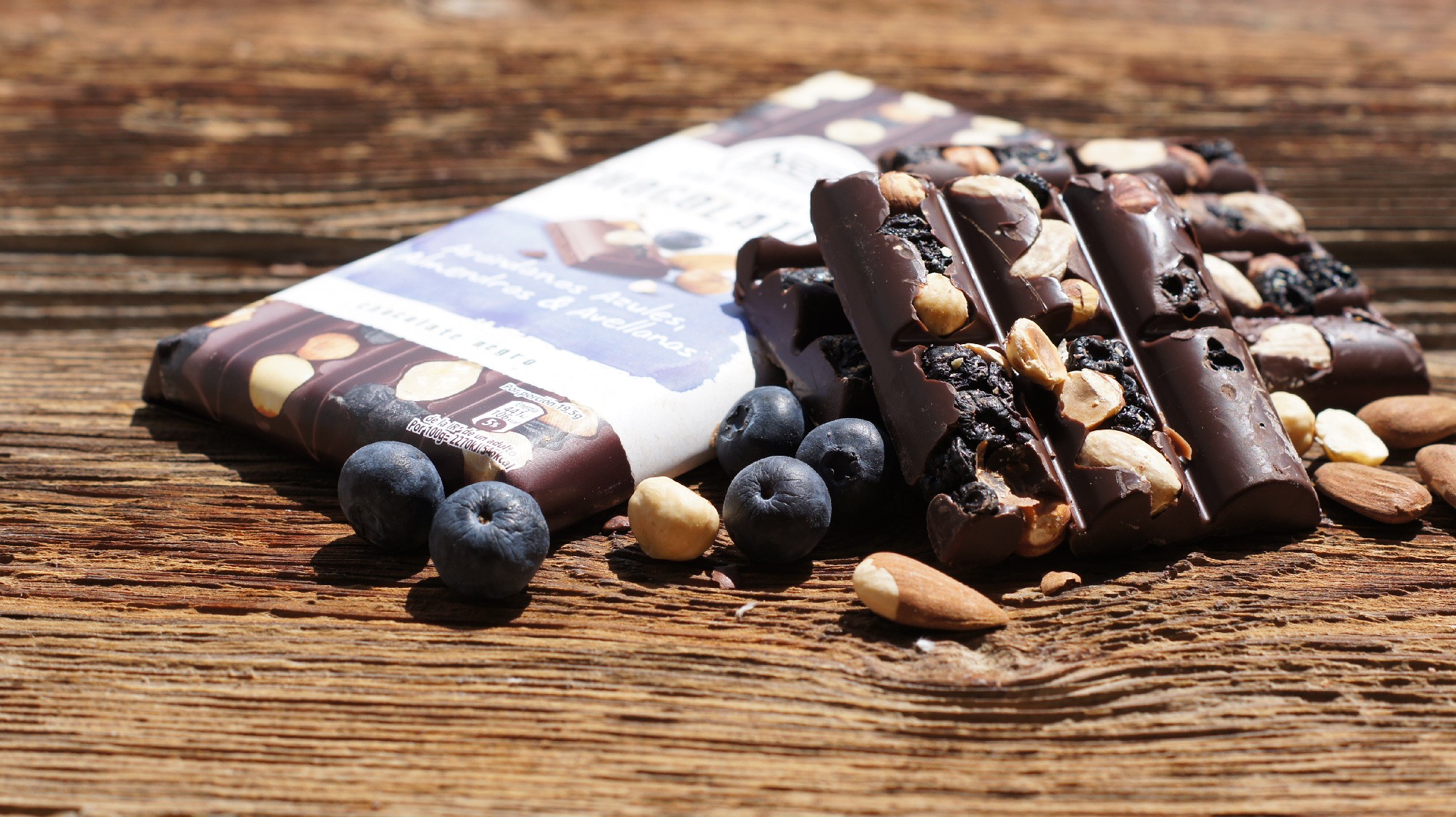 - Chocolate negro con arándanos azules, almendras y avellanas.