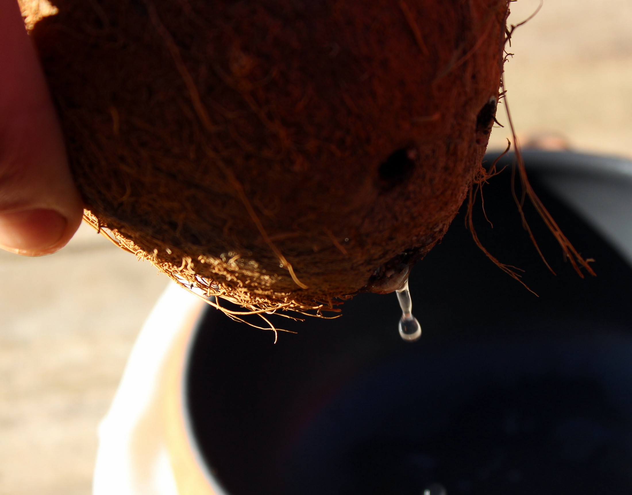 - Perforamos con una brocheta metálica o algún instrumento punzante dos o los tres puntos negros que tiene el coco en uno de sus extremos.