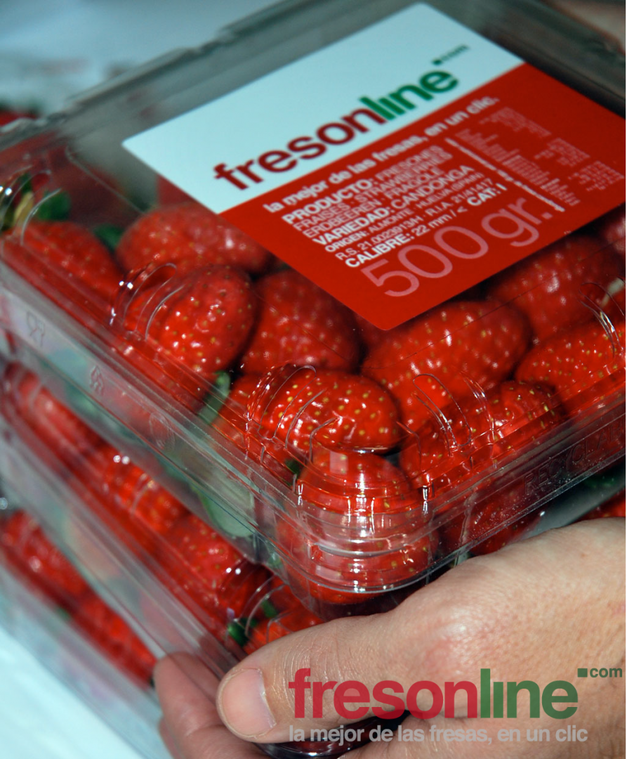La tienda Fresonline.com, nos ofrece la posibilidad de elegir entre dos tipos de fresones, en envases de medio kilo, entre dos tipos de variedades. Una primera variedad denominada «Splendor», una fresa jugosa, más bien grande, de color rojo intenso y con una larga vida después de su recolección. Y «Candonga», un fruto de gran perfume y delicioso al paladar.