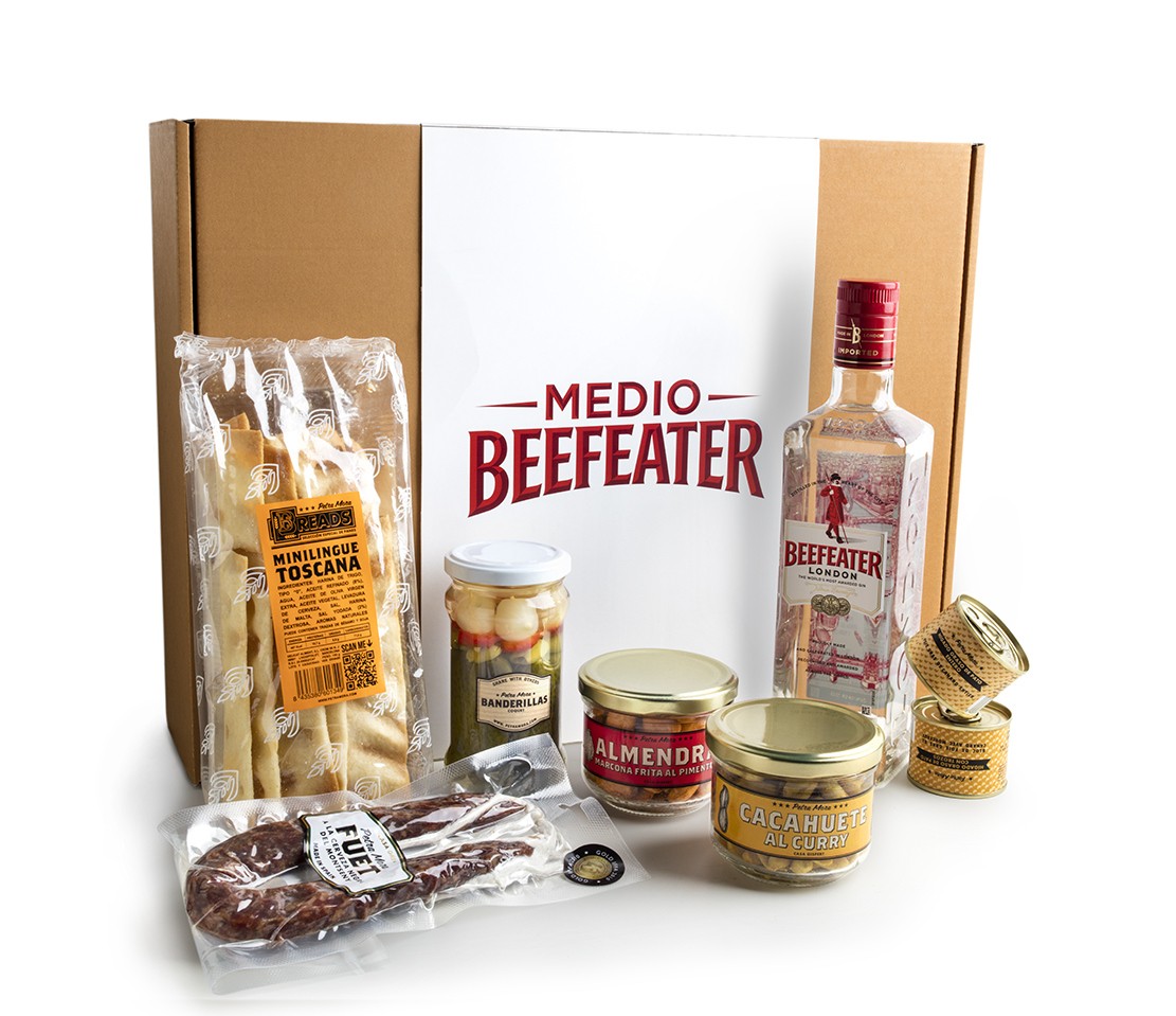 En concreto nos hemos hecho con un pack gourmet para el aperitivo elaborado por Petra Mora y Beefeater que pretende revolucionar la hora del aperitivo partiendo de su innovadora propuesta de consumo, el Medio Beefeater, es decir medio gin tonic servido en vaso corto con dos hielos y un toque de cítrico.