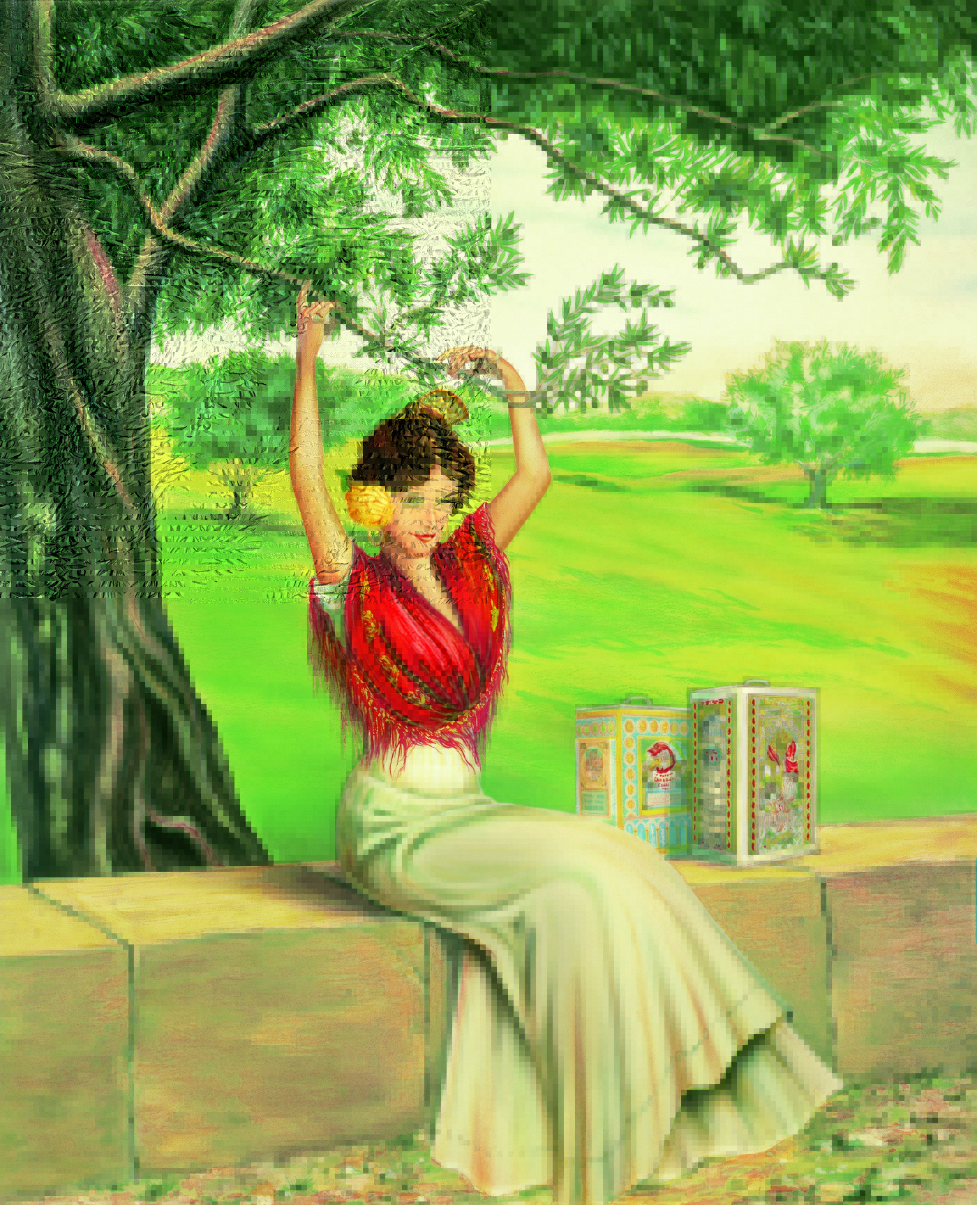 Sobre esta bella botella de cristal esta serigrafiada la famosa gitana de Carbonell. Una mujer que inspiro el lanzamiento del Primer Aceite de la Campaña, cuando cumplió los 100 años de edad.