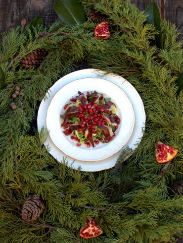 Para quedar bien en nuestro menú de Navidad no tenemos que estar mucho tiempo en la cocina, prueba de ello es esta Ensalada de jamón de pato, granada y vinagreta de turrón de Jijona que os proponemos como entrante para la cena de Nochebuena o la comida de Navidad.