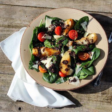 Ensalada de espinacas con pera caramelizada y vinagreta de tapenade de aceitunas negras, una receta facilona para disfrutar sólo o...