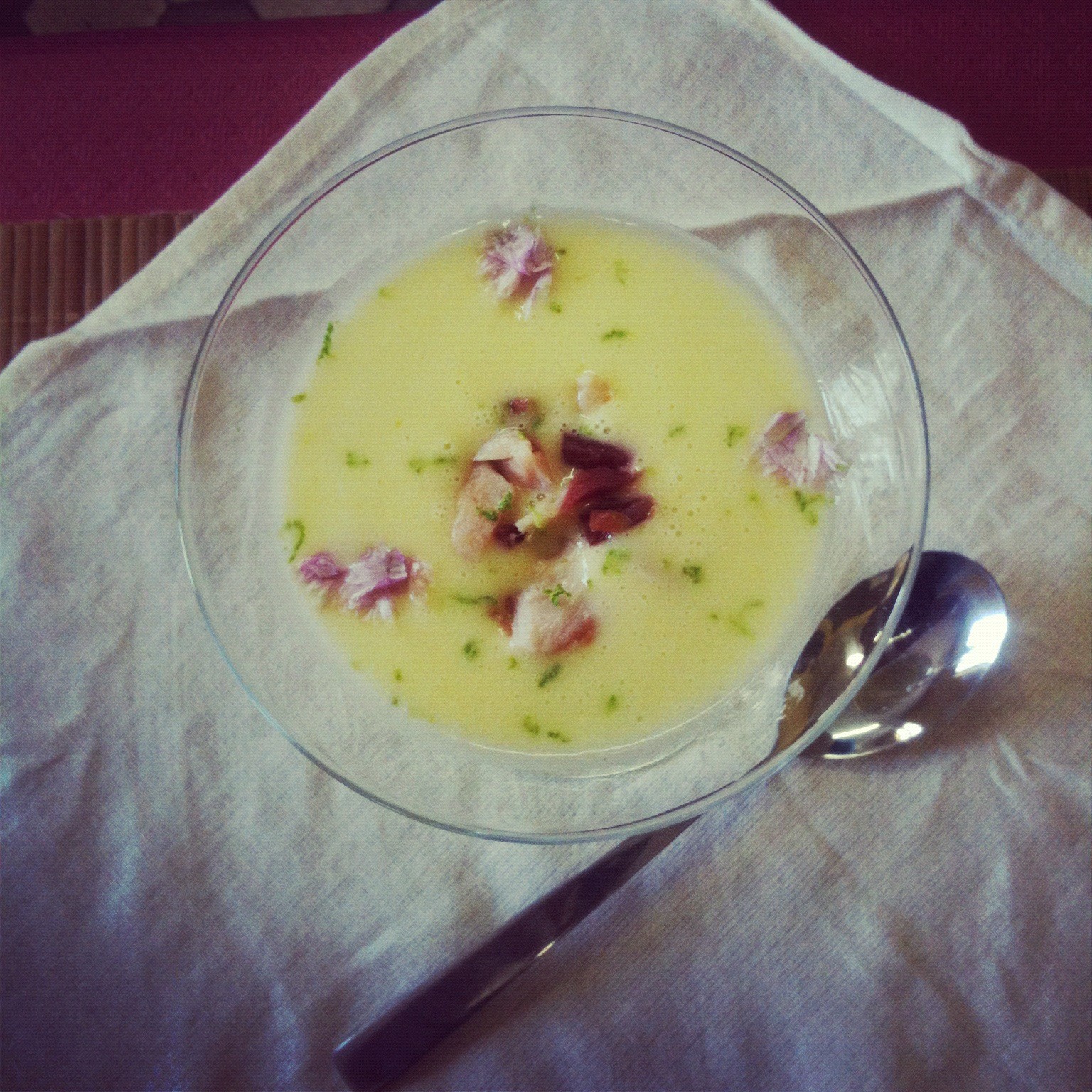 Repartimos el Gazpacho de melón en platos o copas "Martini", añadimos unos taquitos de jamón y decoramos con unas hojas de flores y ralladura de lima, esto último opcional.
