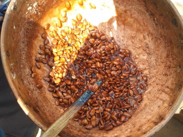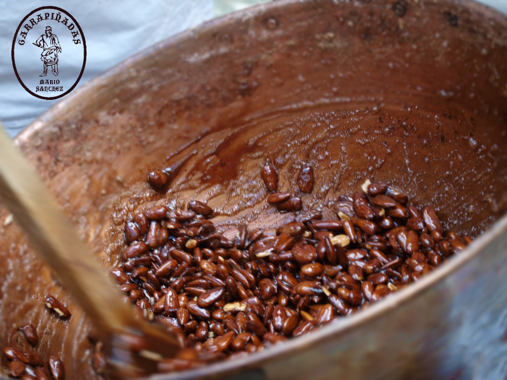 - En la elaboración de las garrapiñadas primero mezclamos los ingredientes (una selección de fruto seco de gran calidad, agua y azúcar -por igual cantidad-), esto se pone al fuego y empieza a cocer, cuando el azúcar empieza a burbujear comenzamos a remover todo el contenido sin parar, las almendras van cogiendo el azúcar poco a poco y seguimos sin parar de remover, cuando estén bien bañadas las damos el tueste y baño de caramelo tan característico de nuestra casa.