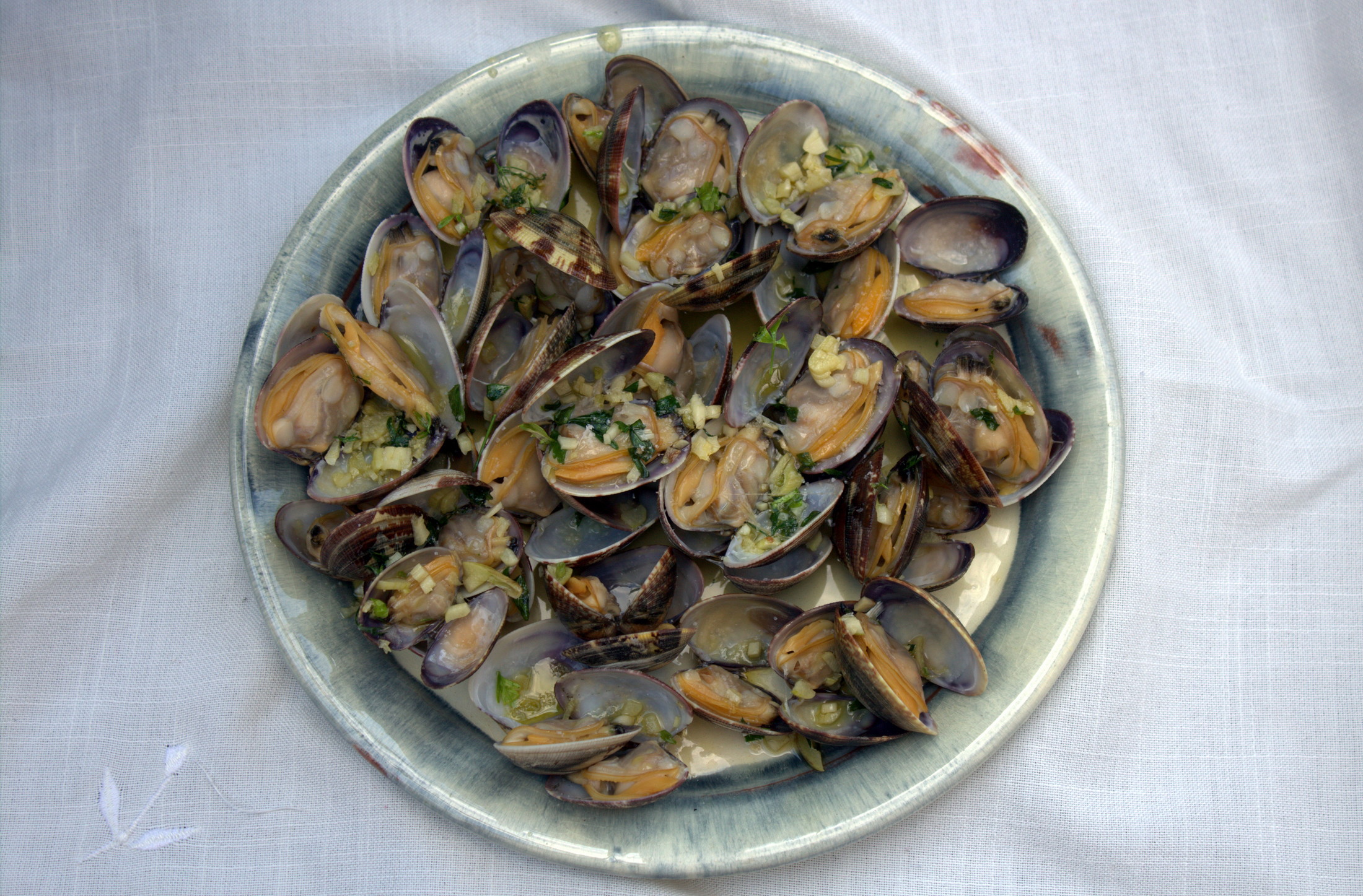 7. Cuando tengamos todas las almejas abiertas en la fuente, vertemos en la sartén anterior la mezcla de aceite, ajo y perejil.