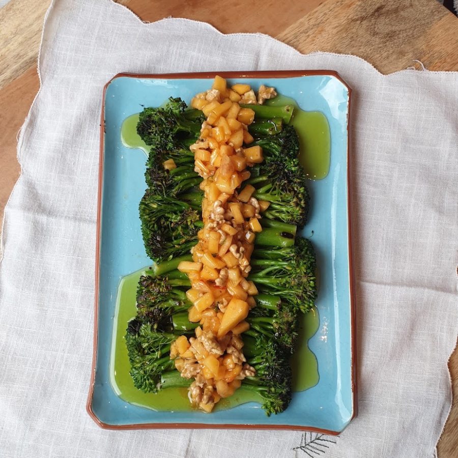 Bimi con vinagreta de kaki y nueces