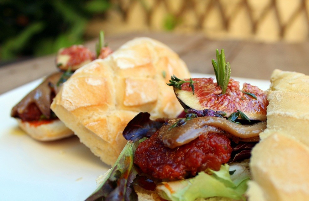 - Repartir unas hojitas de romero y tomillo fresco por encima; colocar la otra mitad de pan por encima y degustar este Bocata de sobrasada y crestas de gallo.