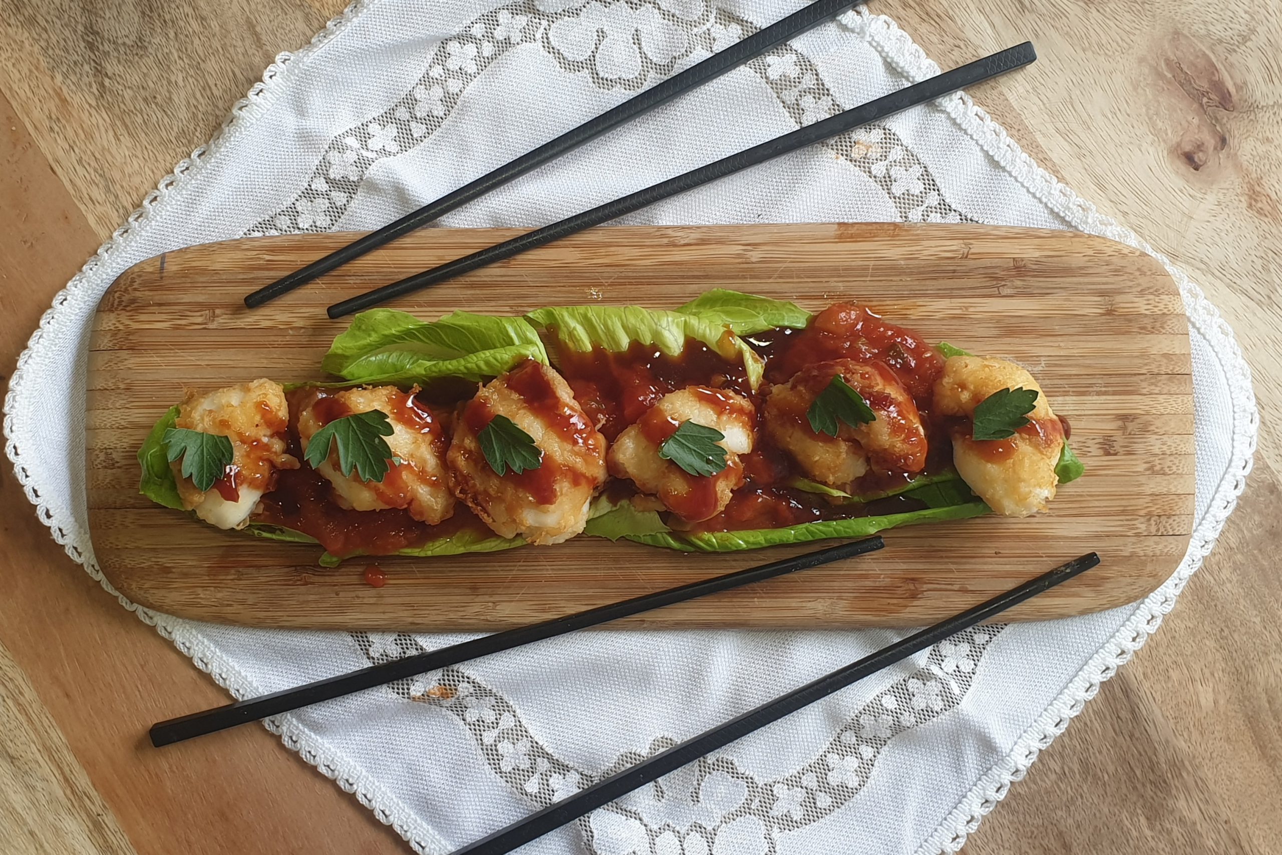 Aderezamos con la salsa oriental y decoramos con una hojita de perejil o cilantro fresco por encima de cada una de las carrilleras.