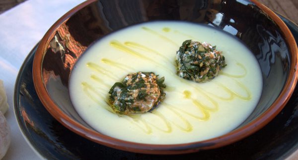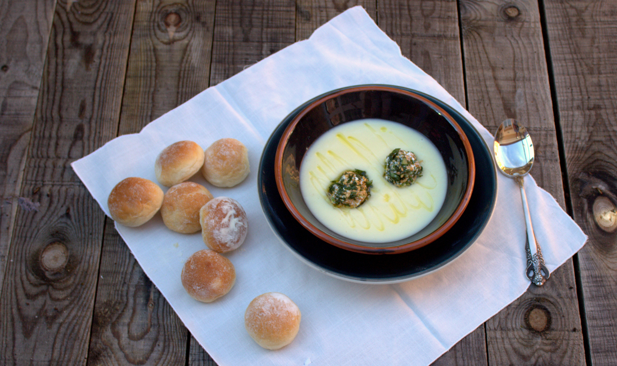 - Servimos la crema de apio nabo, colocamos un par de bolitas en cada plato y aderezamos con un hilo de aceite de oliva virgen extra.