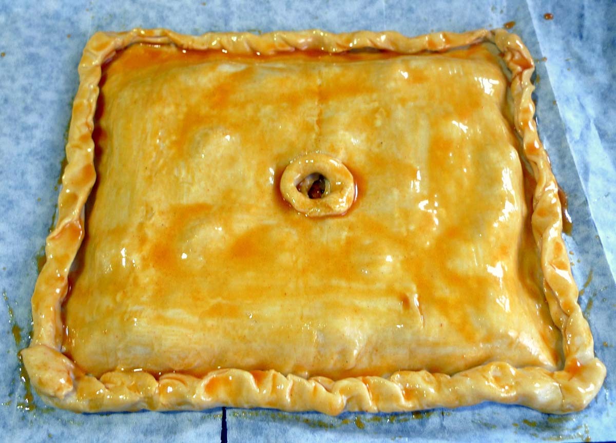 17. Introducimos la empanada en la ranura más baja del horno, pero no en la base (previamente precalentado a 170º), 35 minutos.