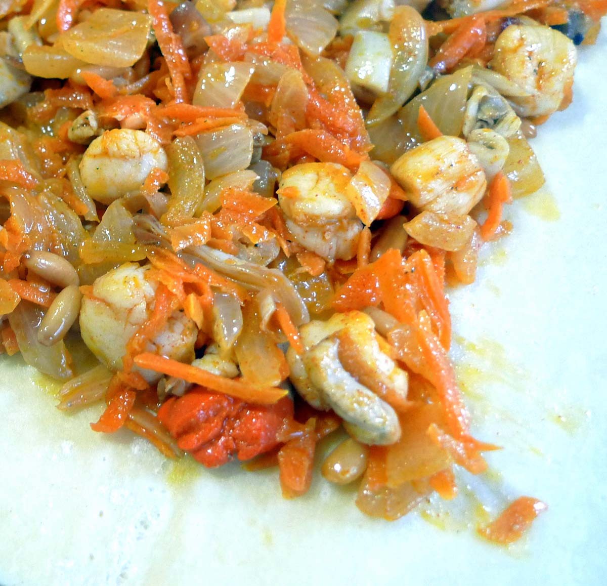 6. Añadimos las zamburiñas en la sartén de las verduras, salteamos, incorporamos las navajas, los piñones y una cucharada de café de pimentón dulce, removemos.
