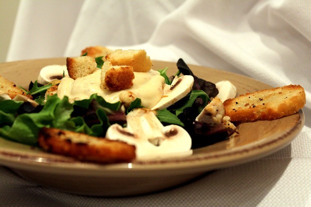 8. Salseamos la ensalada con la Salsa César y terminamos esparciendo por encima los picatostes de pan, láminas de champiñones, limpios y al natural, y queso parmesano rallado.