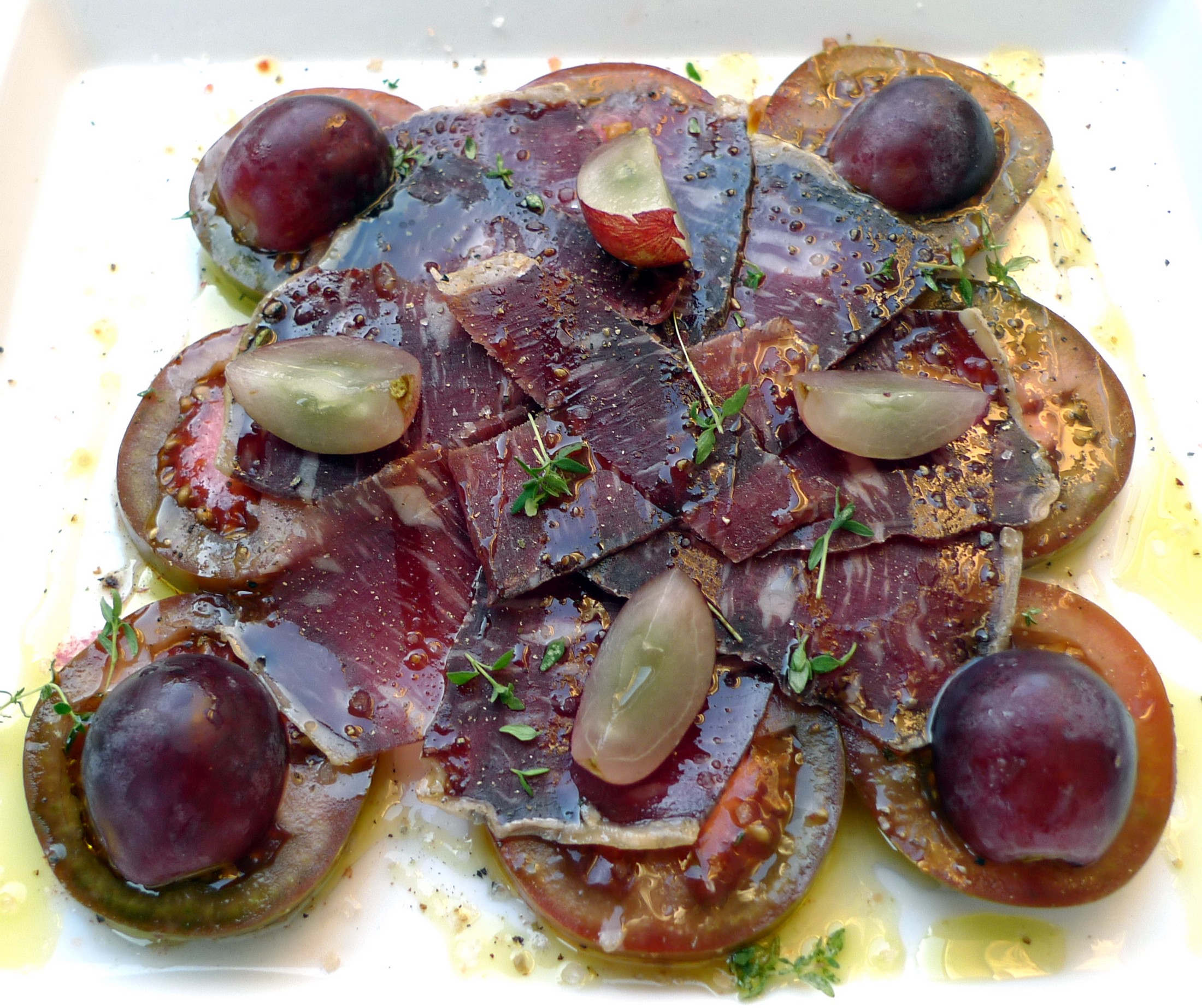 En verano seguimos disfrutando de variadas y ricas recetas, como esta original ensalada de cecina, tomate kumato y uvas