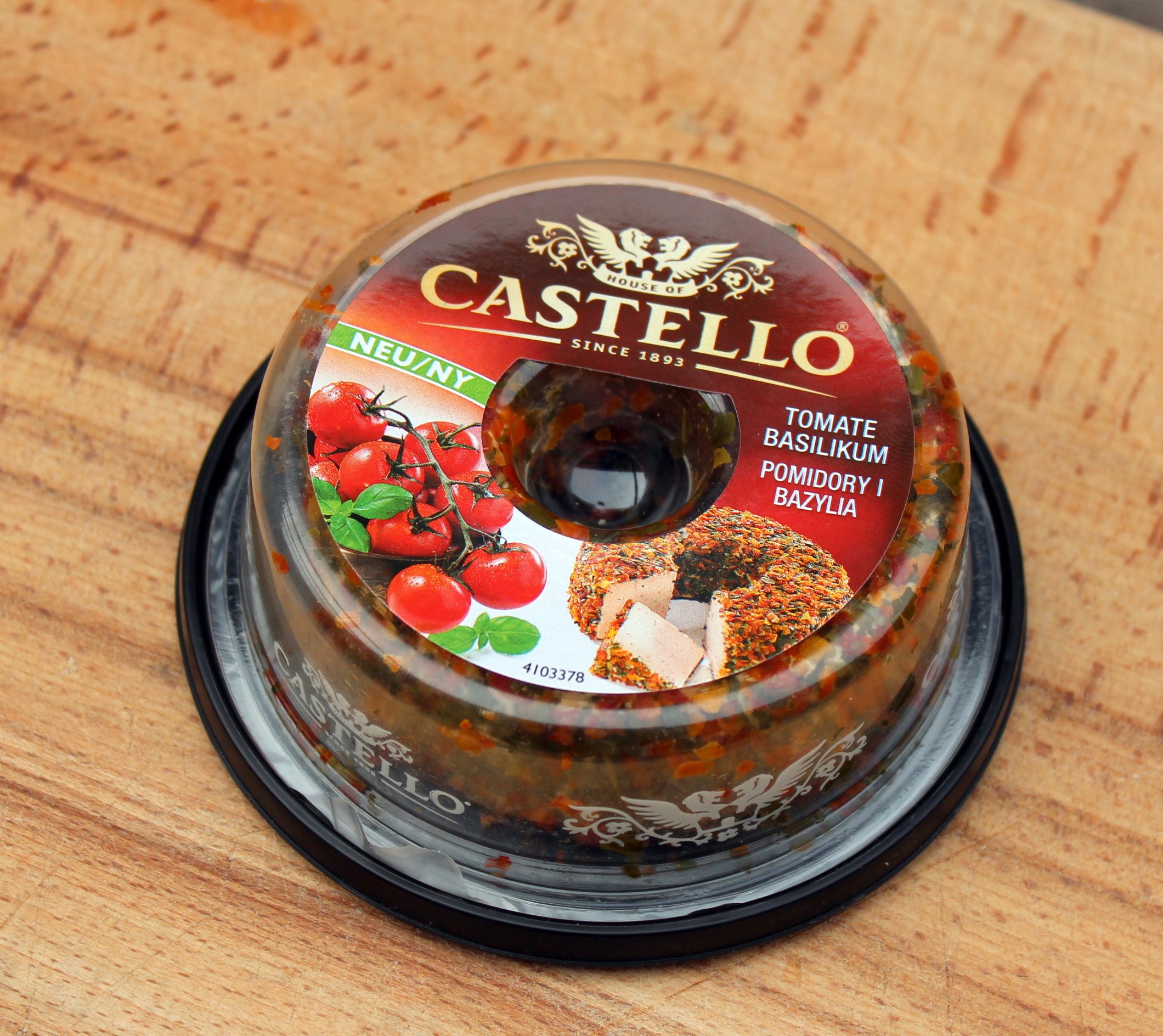 - Sacamos el queso Castello de Tomate y Albahaca de su envase y colocamos en el centro de un plato de presentación.