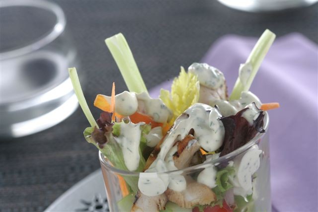- Monta la ensalada de pollo en un vaso con la manzana y el pollo cortados en lonchas finas y acompaña de lechugas variadas, tomates cherrys partidos a la mitad, las julianas de apio y zanahoria y todo regado con la salsa de mostaza y Philadelphia.