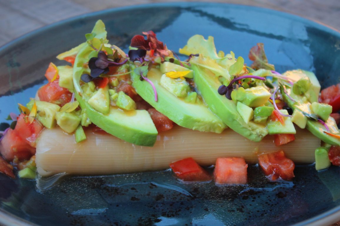- Esparcimos el tomate y el aguacate por encima de los puerros.