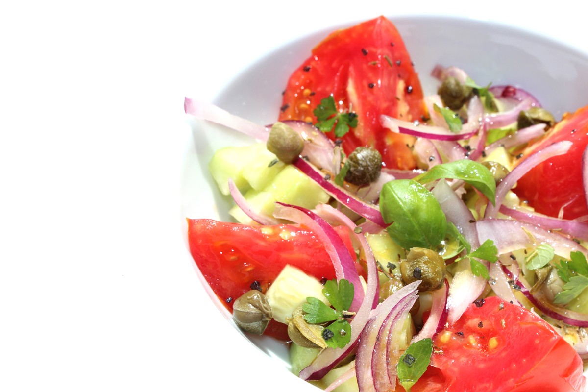 - Repartimos por encima dados de pepino, tiras de cebolla roja y unas cuantas alcaparras.