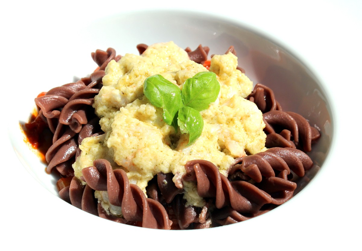 Con unos espirales de pasta al cacao de chocolates Pancracio hemos elaborado esta original receta de pasta: Espirales al cacao con pesto de gambas.