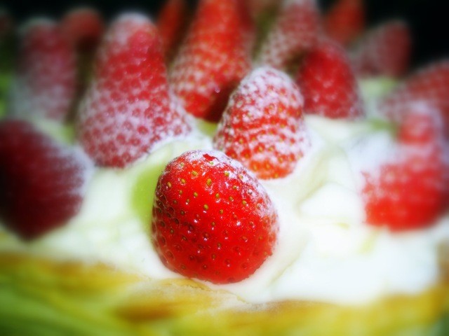 - Una vez tengamos hecho y frío el hojaldre, sólo nos queda rellenarle con la crema del queso y distribuir por encima los fresones limpios y sin hojas.