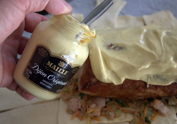 11. Colocamos el lomo de cerdo en el centro. Cubrimos con mostaza.
