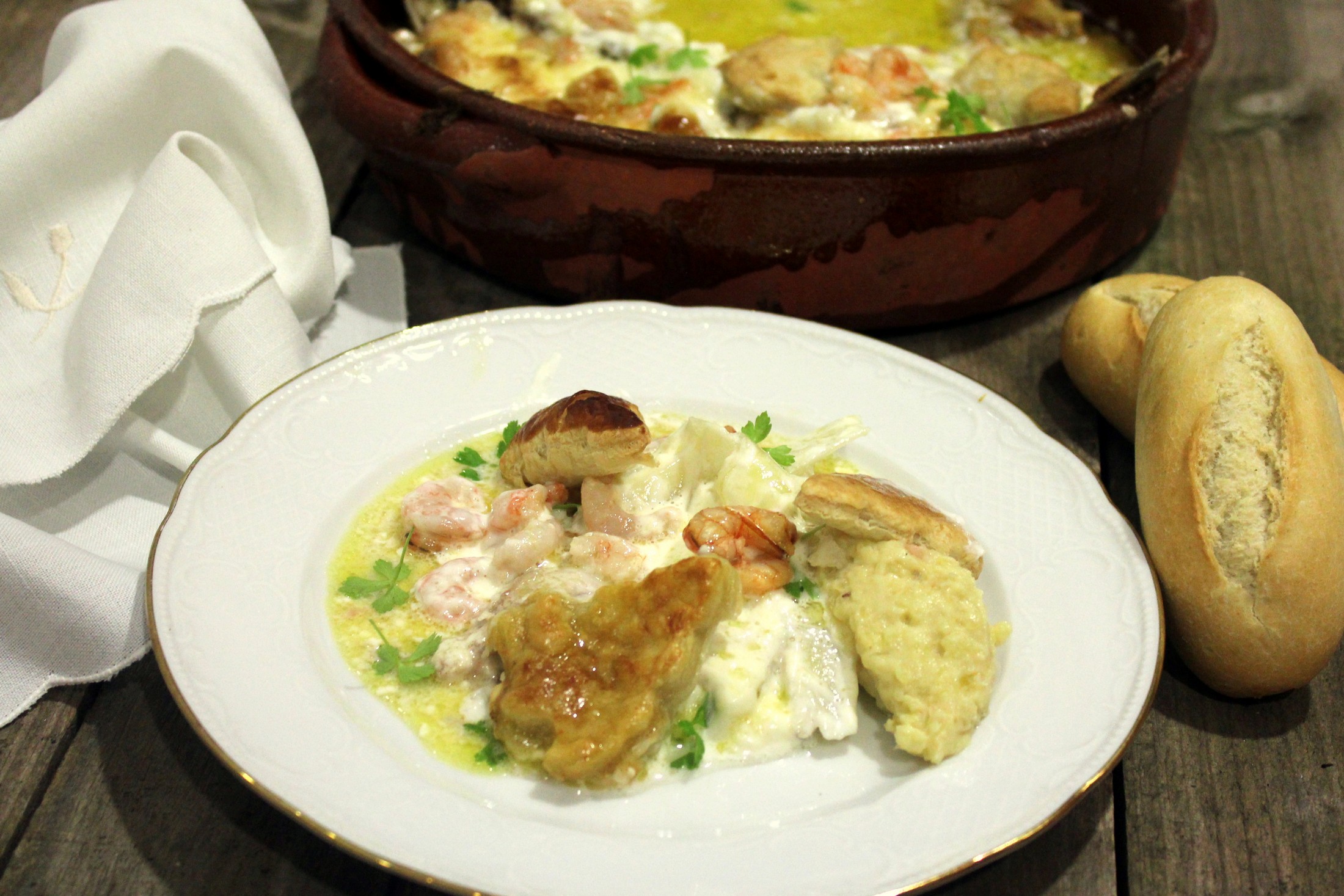 - Repartimos las gambas por encima de la carne de la lubina y cubrimos con la mezcla anterior.