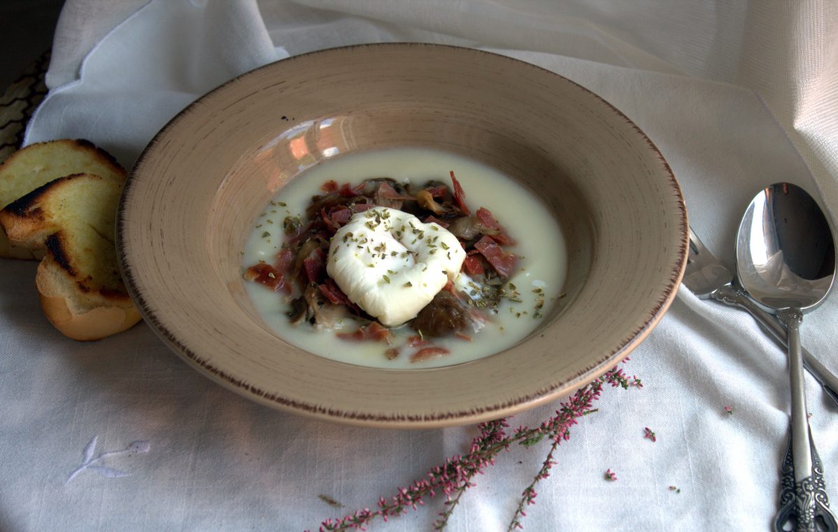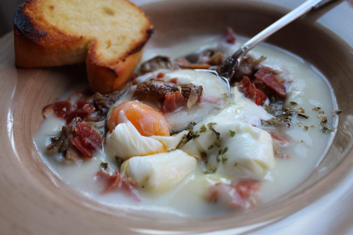 Añadimos el jamón serrano picado y dejamos hacer un minuto más. Retiramos la sartén del fuego y tapamos. De esta forma los niscalos se infuisonarán con el ajo y soltarán un jugo que será una delicia junto con el puré de patata y el huevo poché.